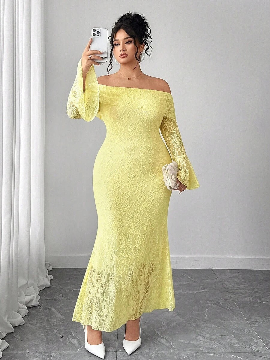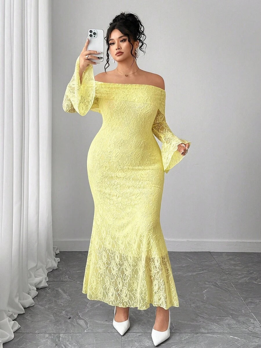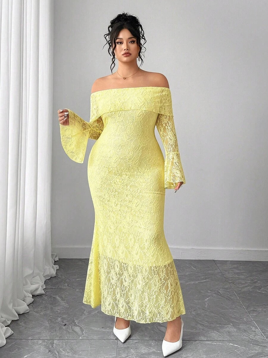 SHEIN Elenzga فستان طويل مكشوف الكتف مزين بالدانتيل والزهور بلون أصفر