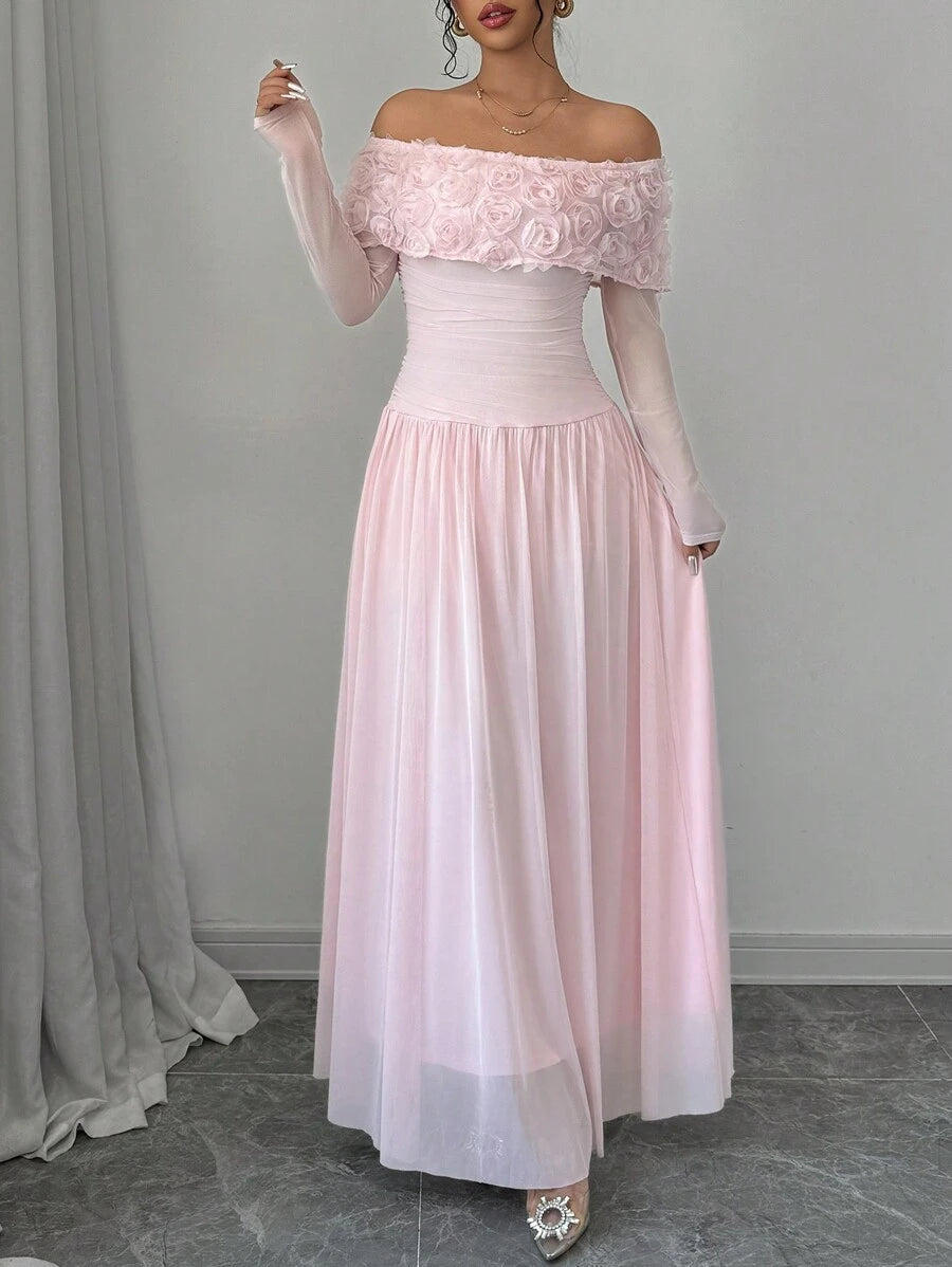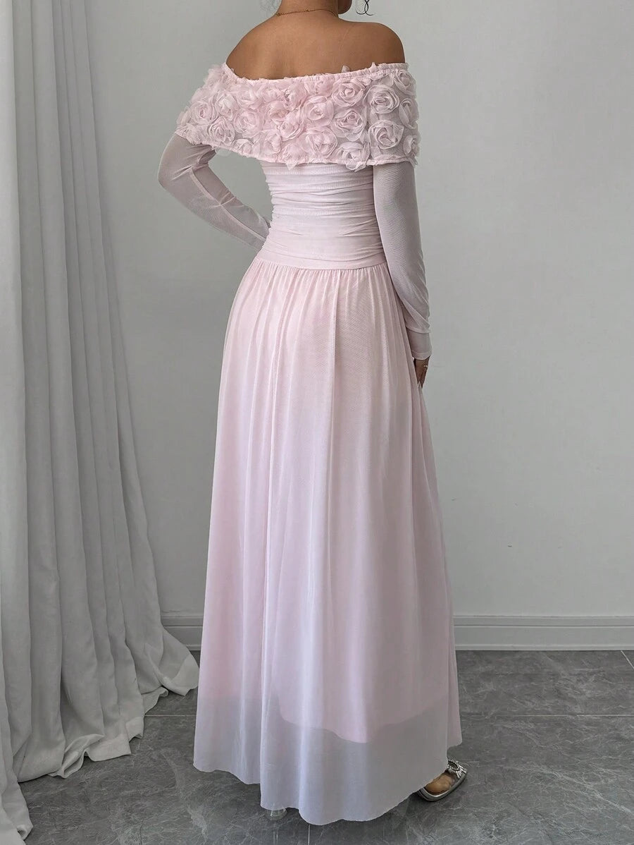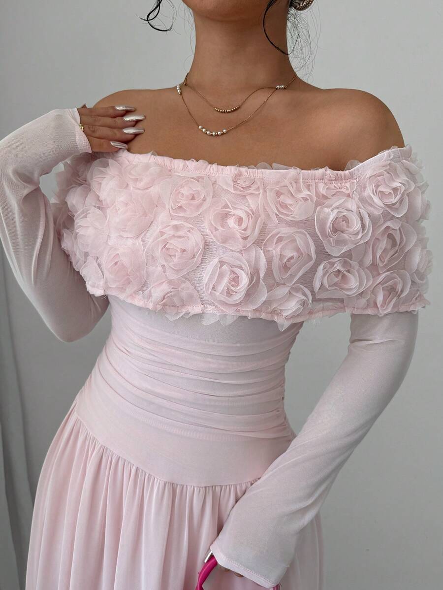 SHEIN Glyssa فستان ماكسي وردي مزين بالفراشات وكتف مكشوف