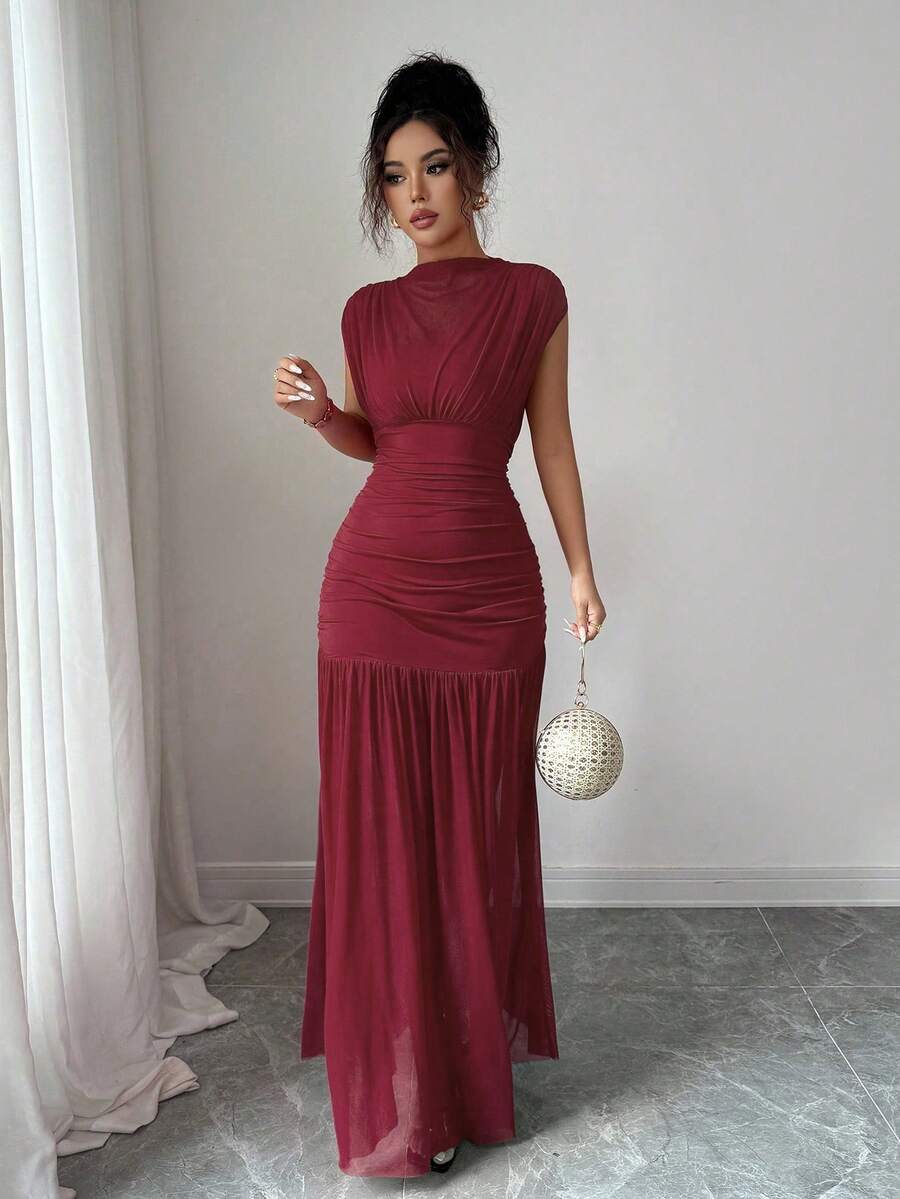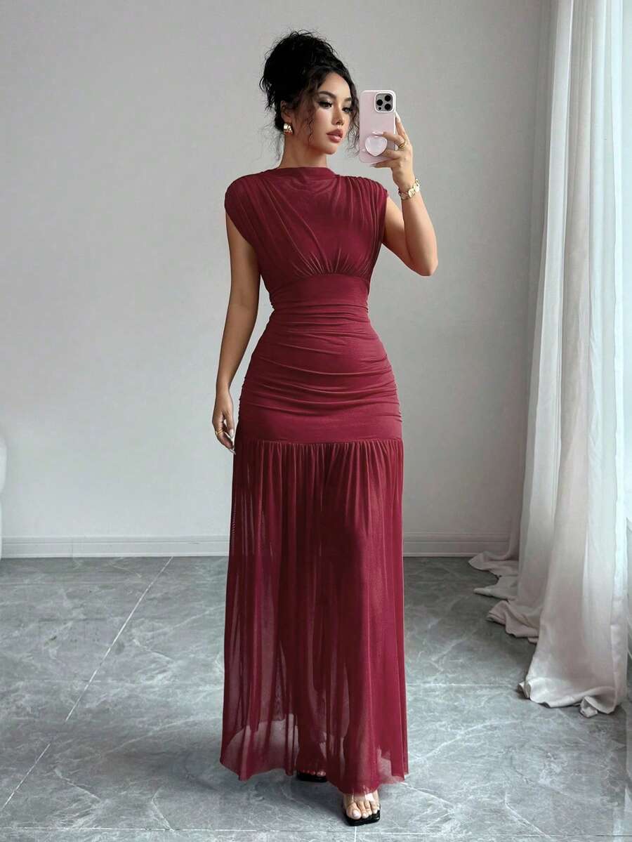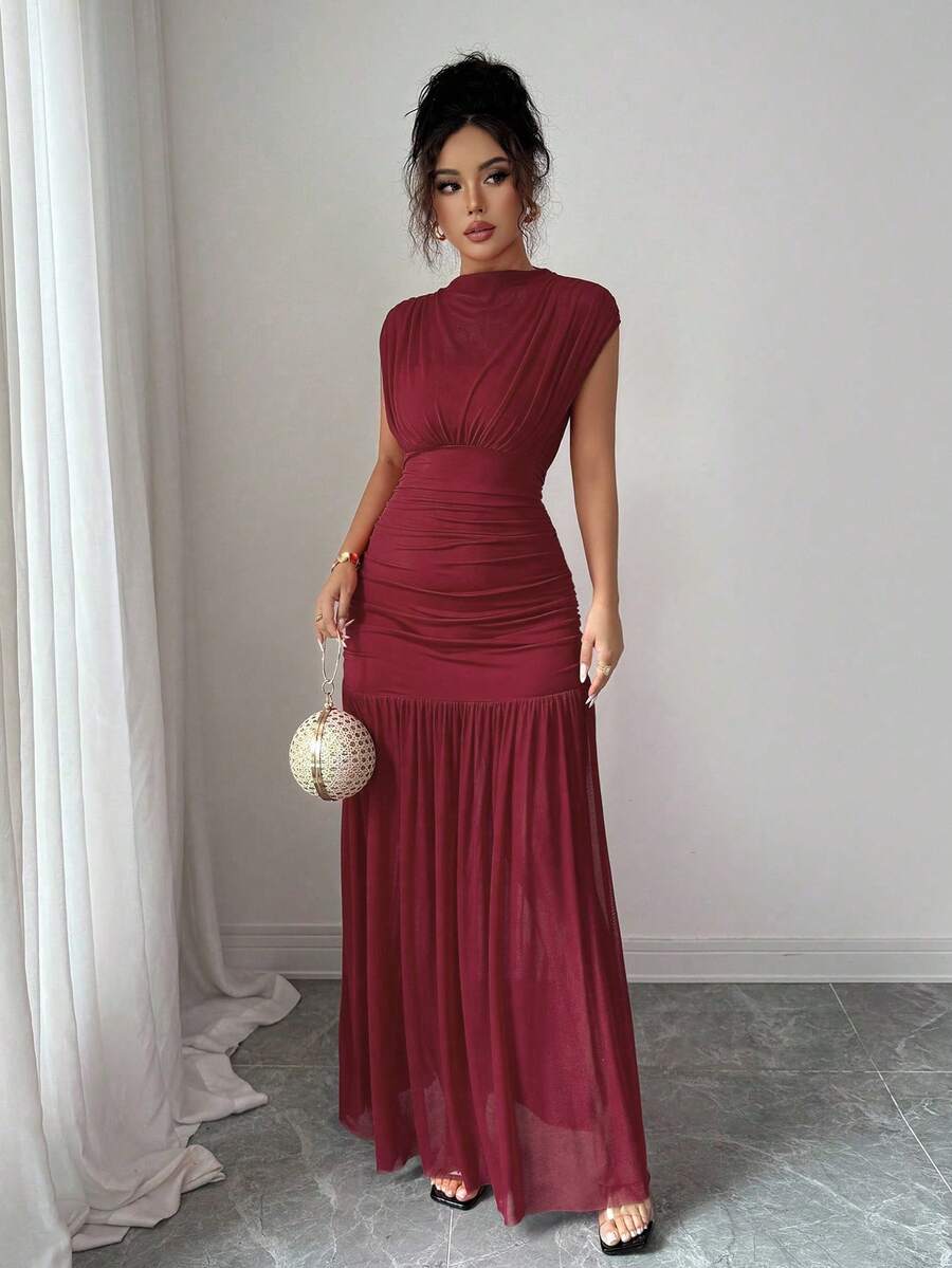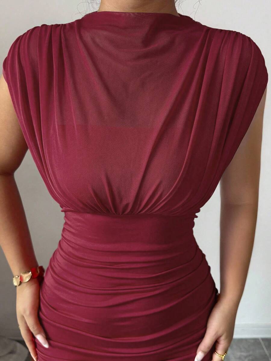 SHEIN Elenzga فستان عنابي بياقة مرتفعة بدون أكمام من شبكة مفرغة