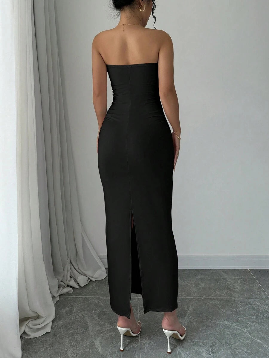 SHEIN Elenzga فستان ماكسي اسود مزخرف بزهور وأربطة على الفخذ