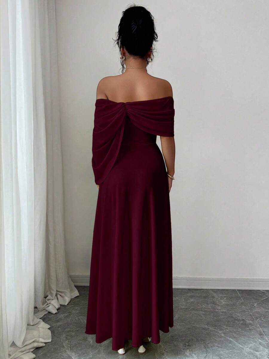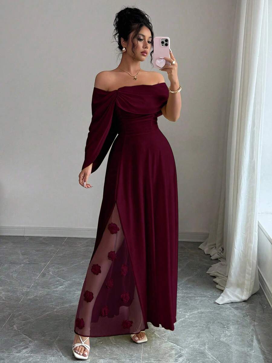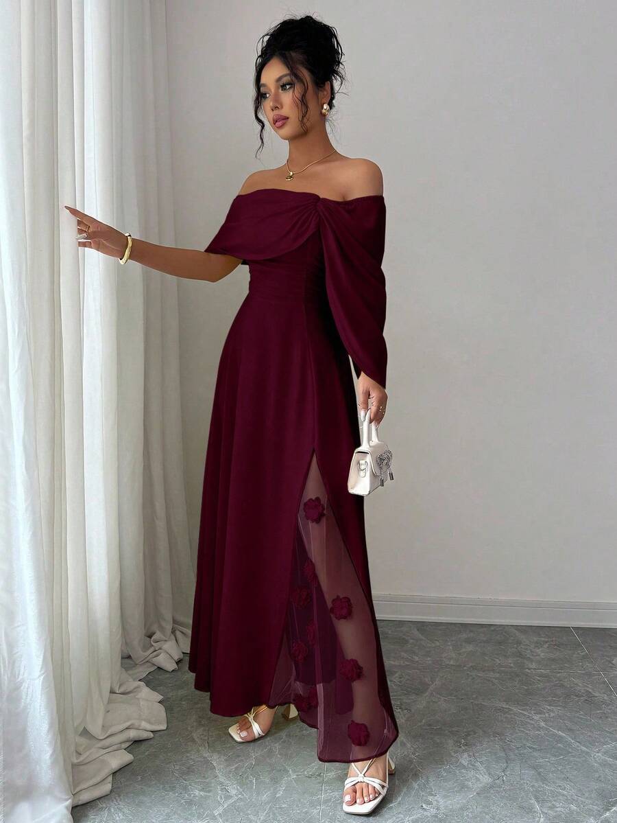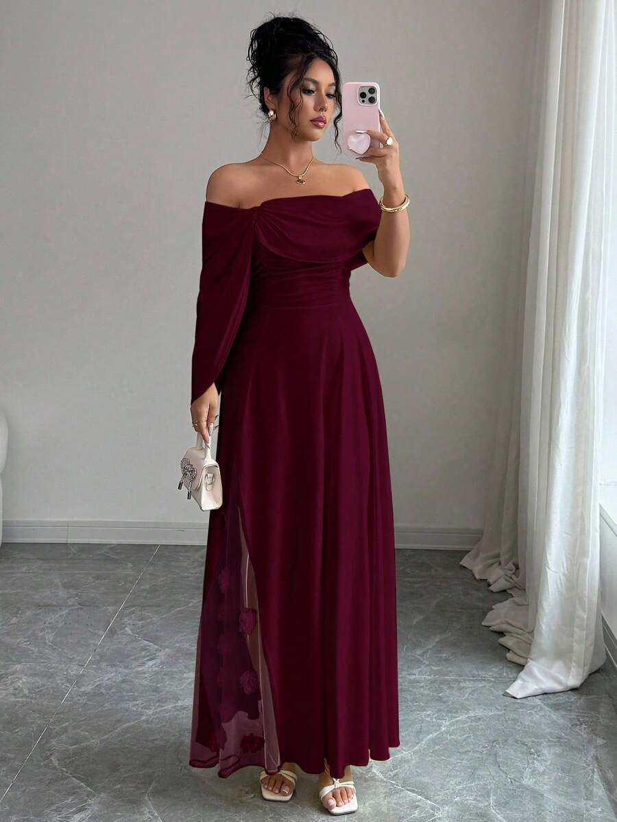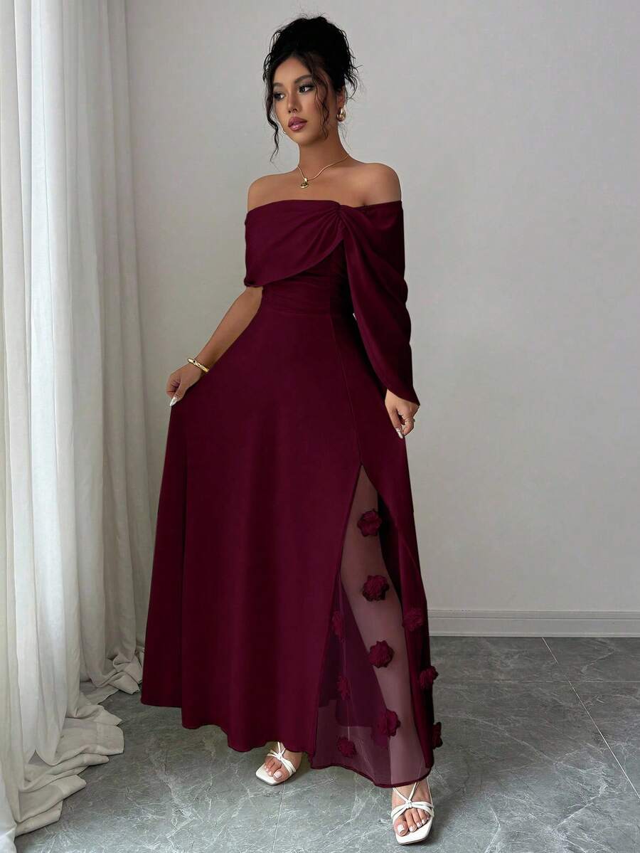 فستان ماكسي طويل أنيق للنساء، مزين بزهور ثلاثية الأبعاد عند الخصر، تصميم A-line ضيق وخط عنق قبالة الكتف، مناسب للحفلات والمناسبات الرسمية.المواصفات: