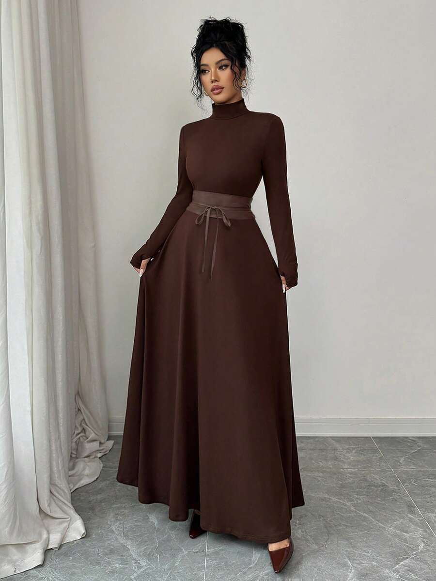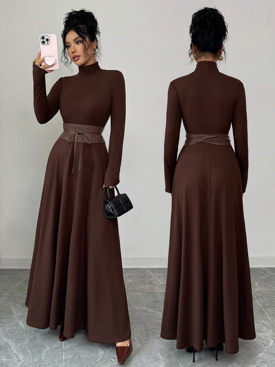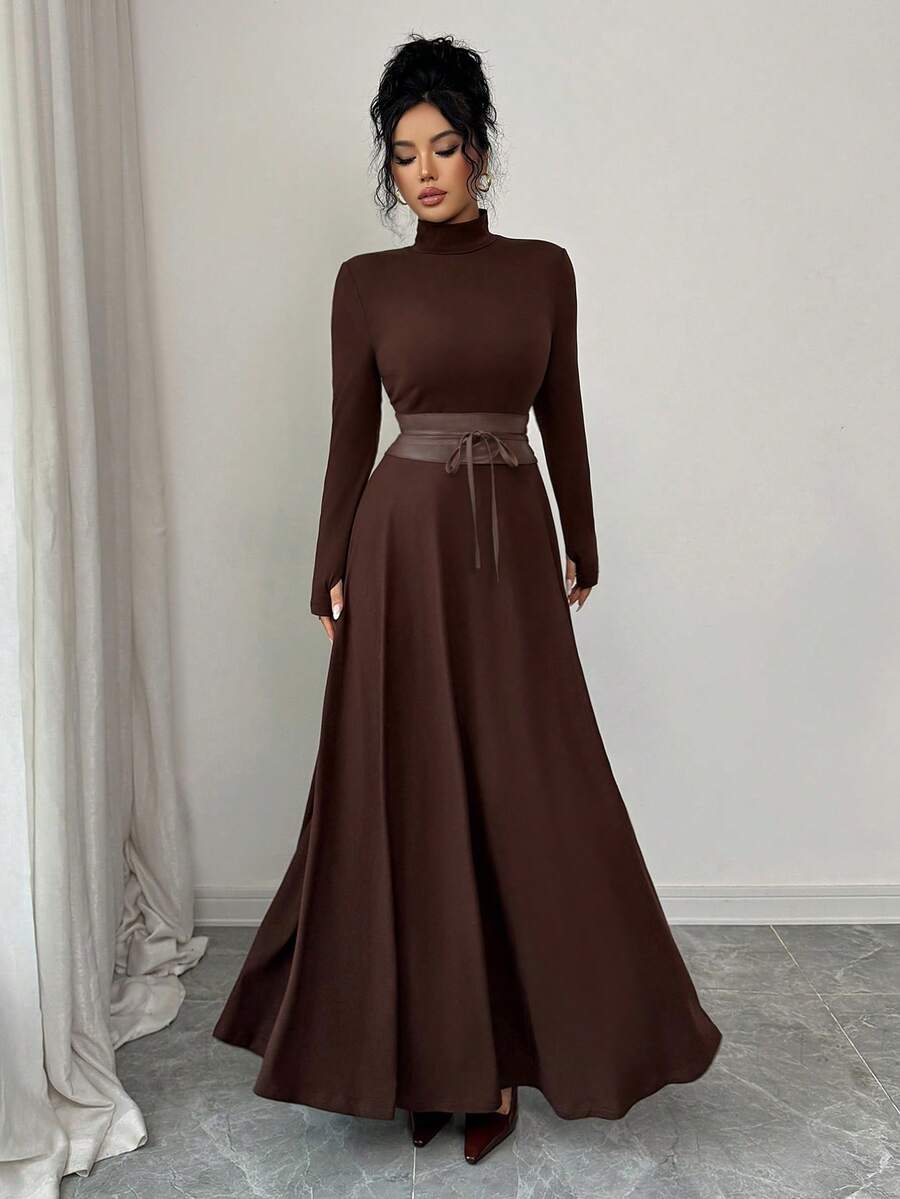 SHEIN Elenzya فستان بني محبوك طويل بياقة نصف عالية وحزام خصر