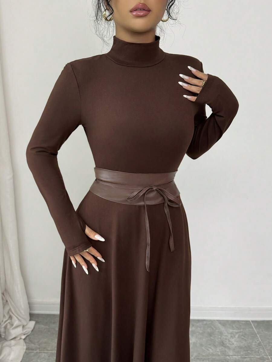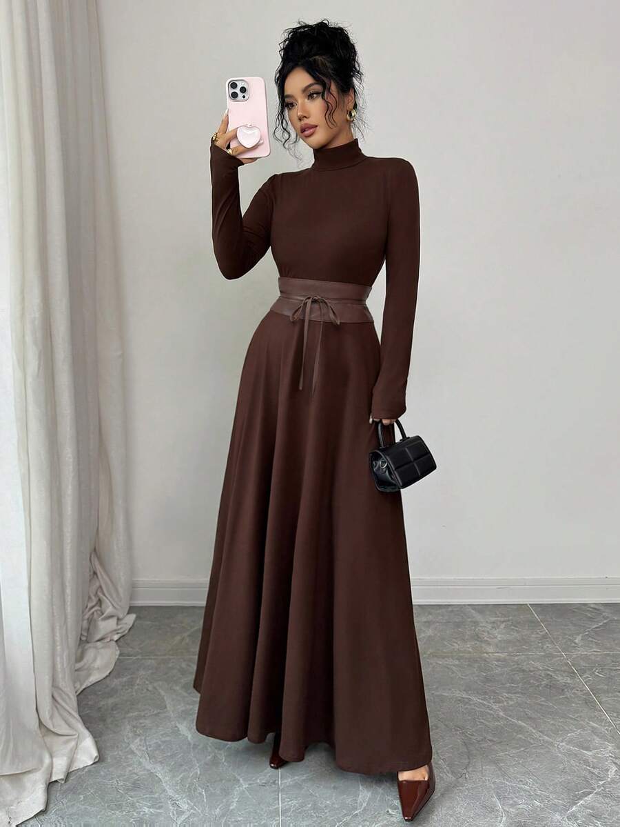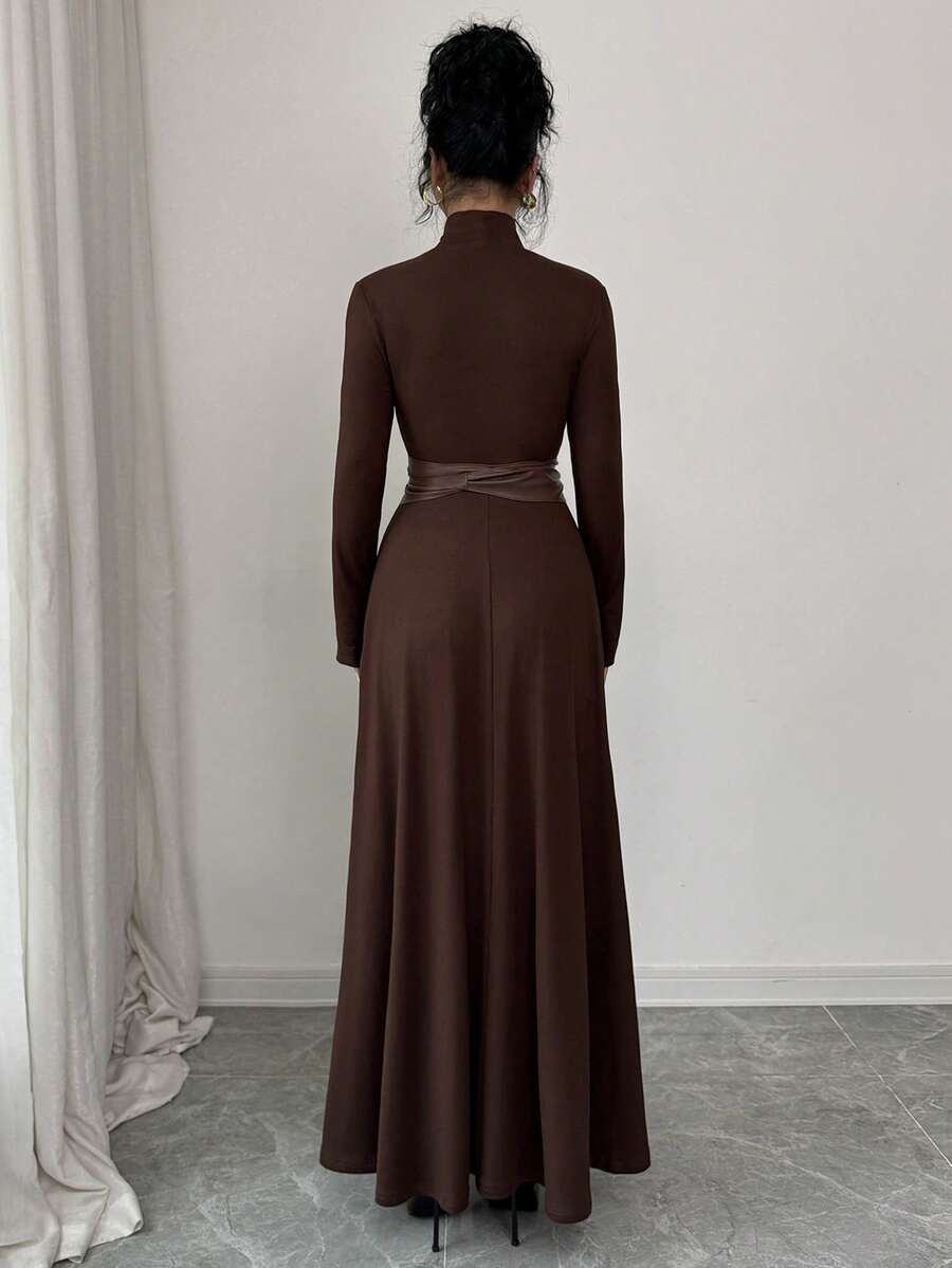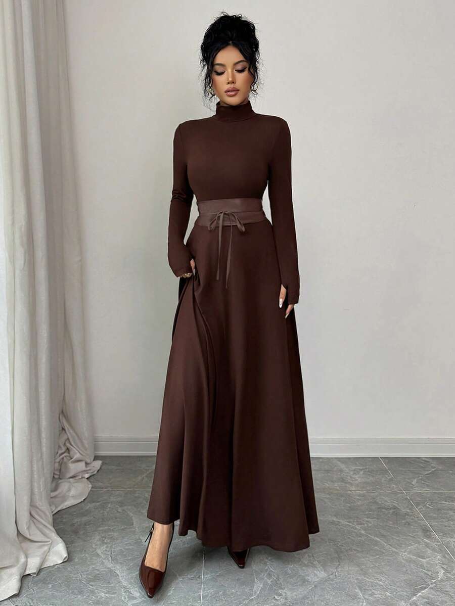 SHEIN Elenzya فستان بني محبوك طويل بياقة نصف عالية وحزام خصر
