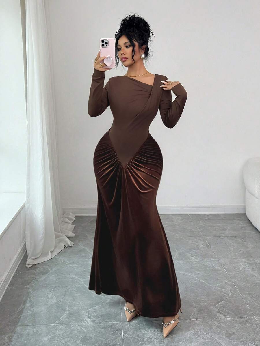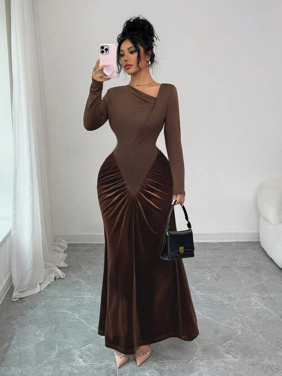 فستان نسائي جديد التصميم بأكمام طويلة مضفر بالقطيفة على الكتف المائل، تصميم ضيق الخصر