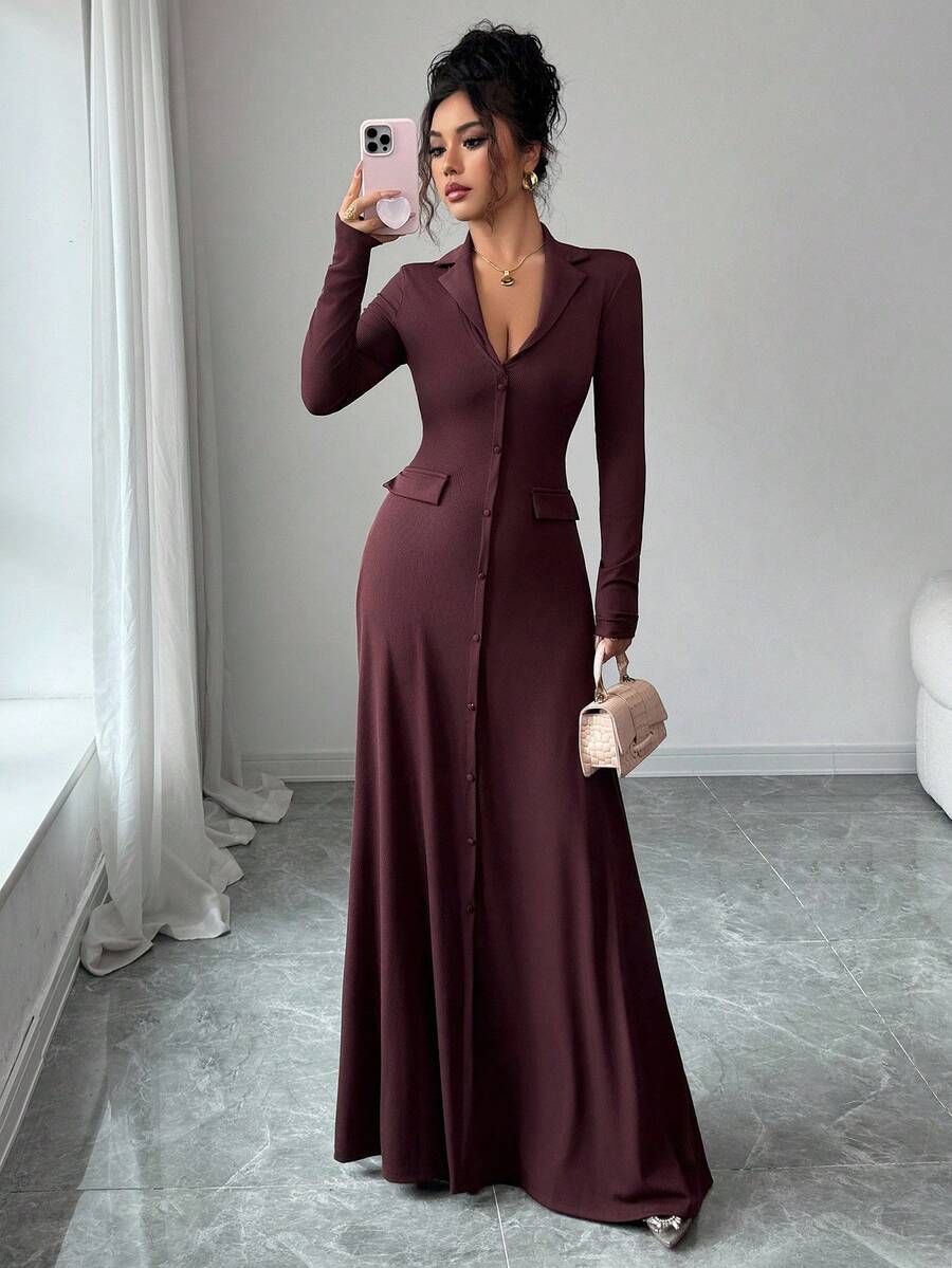 SHEIN Elenzya فستان محبوك أنيق بلون بني داكن