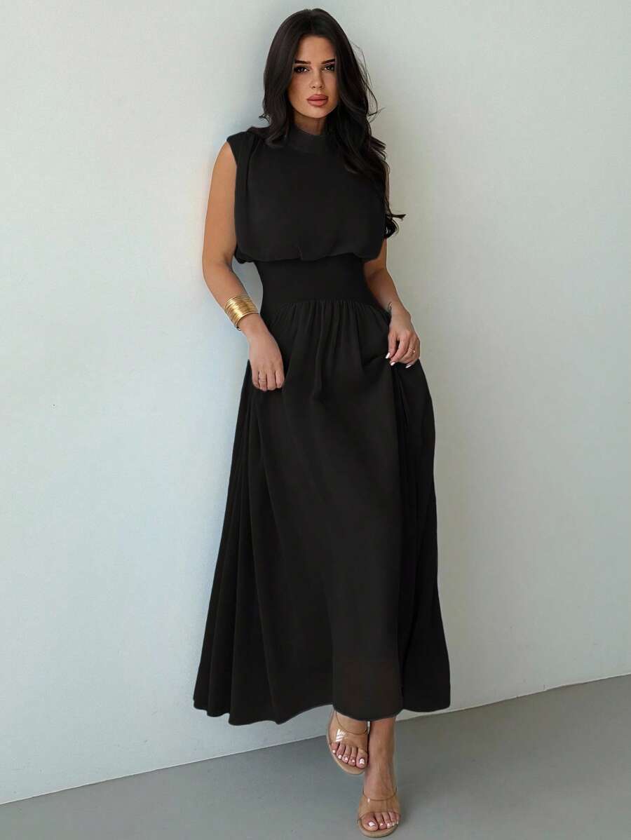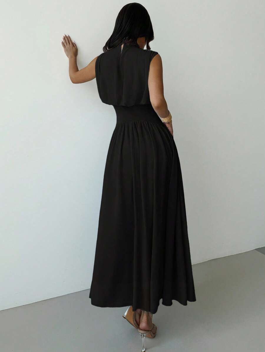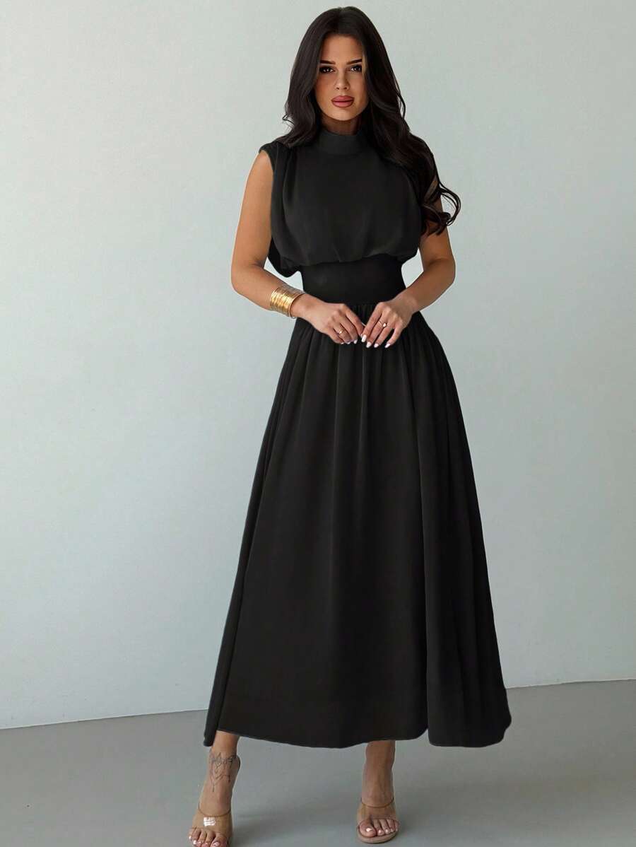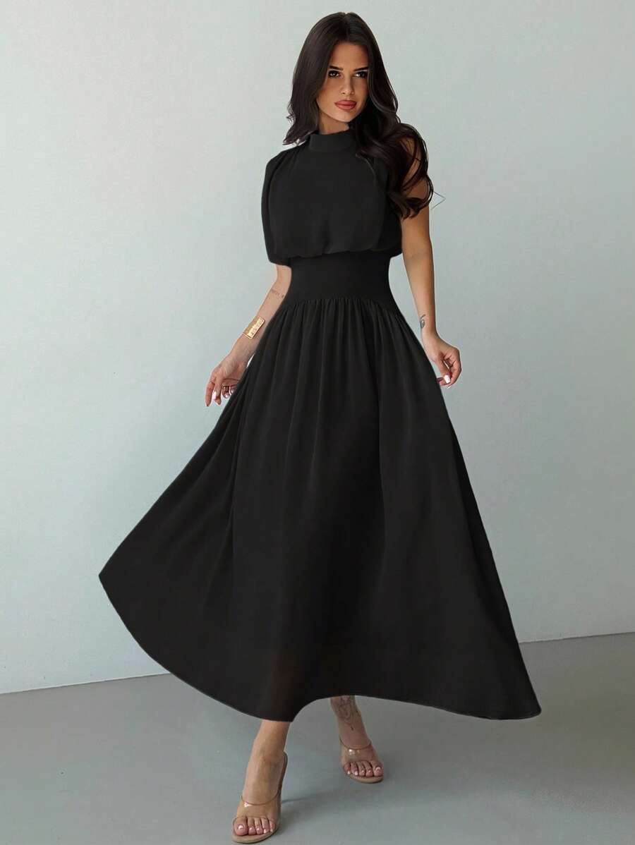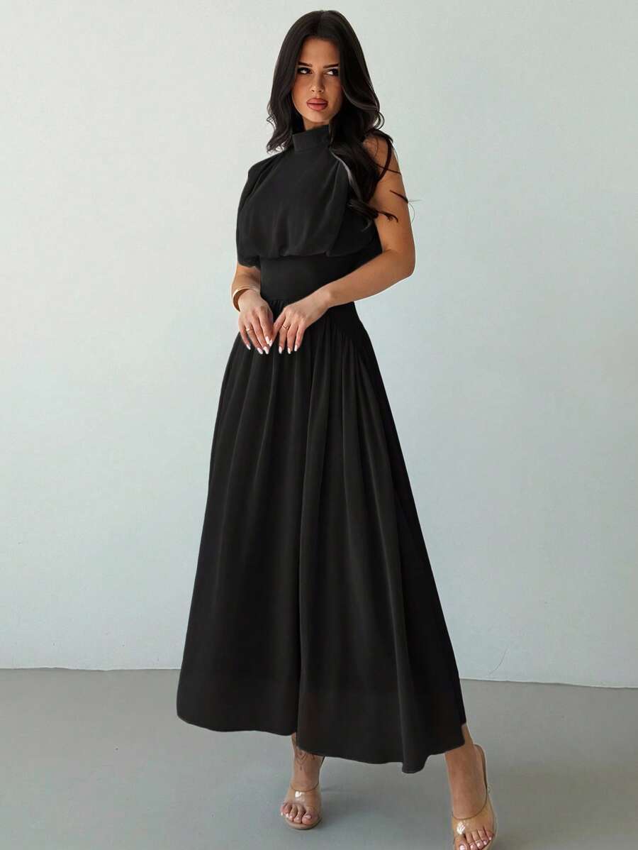 SHEIN Firerie فستان ماكسي اسود بخصر مشدود وياقة عالية
