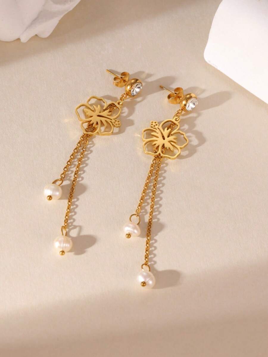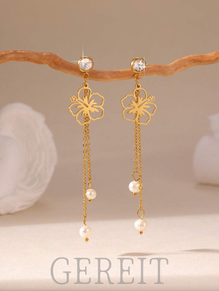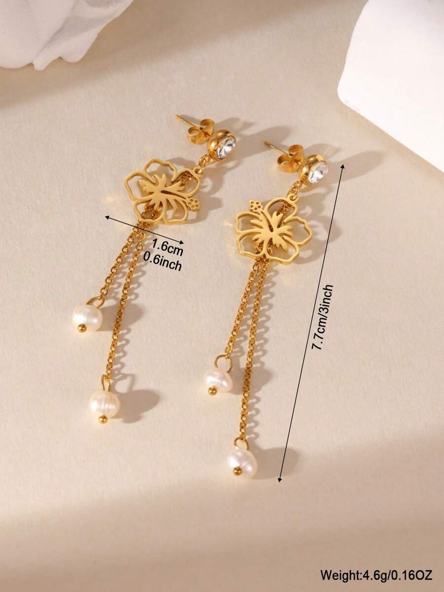 SHEIN GEREIT زوج أقراط ستانلس ستيل مزينة لؤلؤ وزهرة وزركونيا