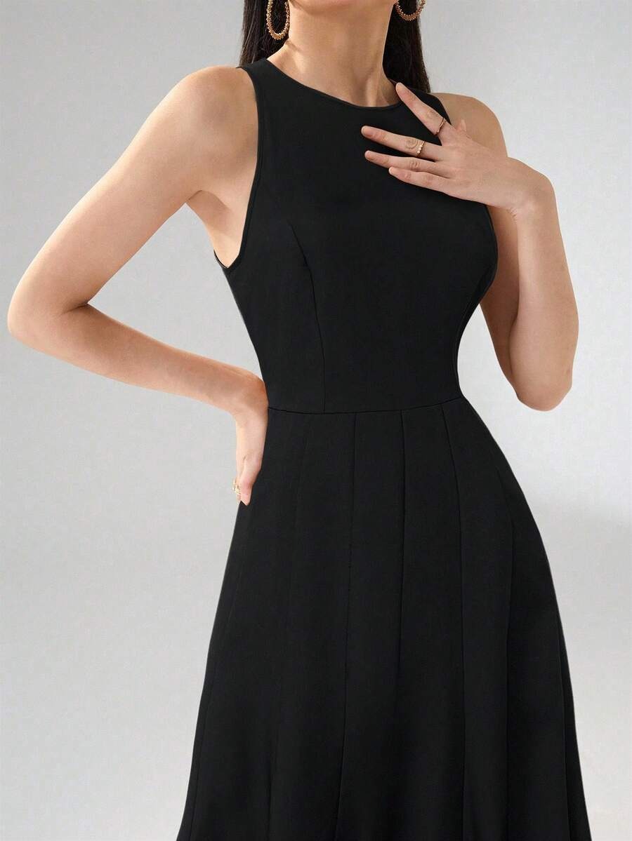 فستان Heiryn أسود مموج بقصة A وياقة دائرية – ستايل أنيق وعصري 🖤🌊