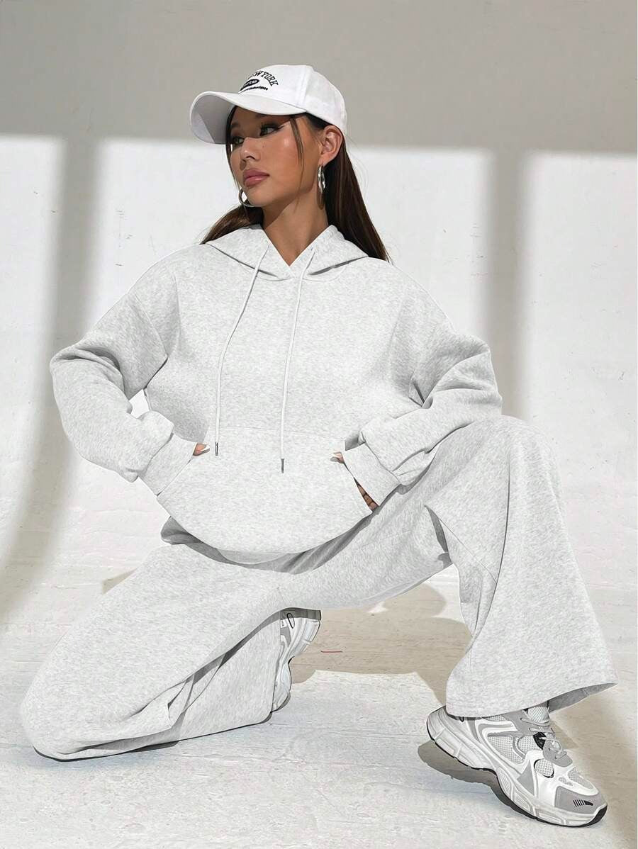 طقم عملي وكاجوال مكوّن من هودي بأكمام طويلة وبنطلون طويل، بقصة مريحة ومنخفضة الأكتاف. التصميم سادة وناعم مع جيوب ورباط في الخصر. القماش خفيف ومرن شوي، مناسب لأيام الربيع والخريف.