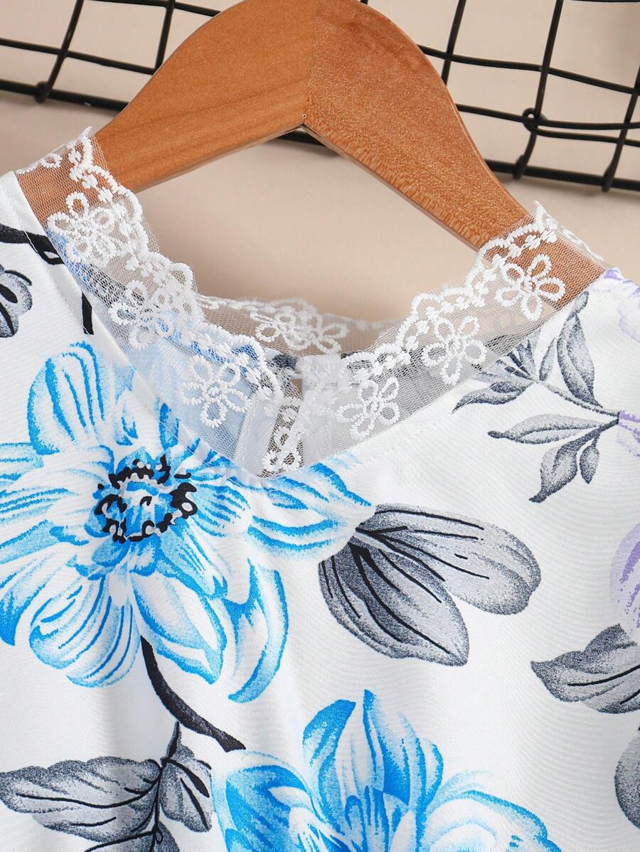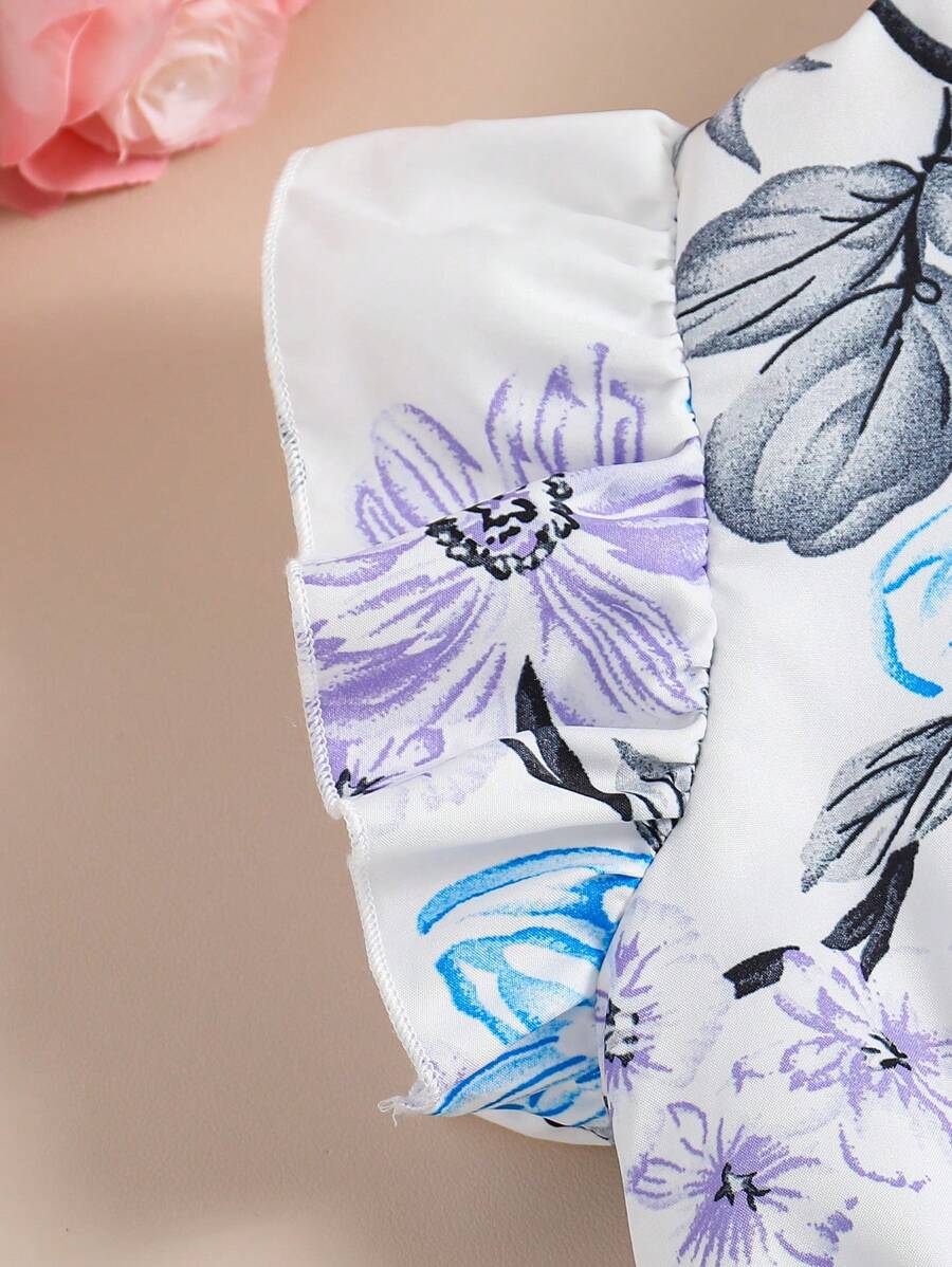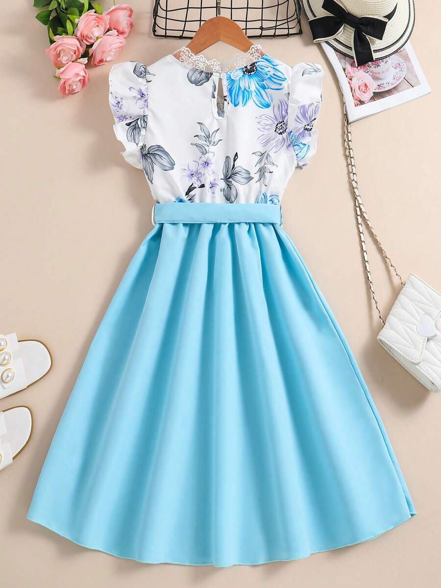 SHEIN Kids CHARMNG فستان بنات مراهقات مزين بطبعات الزهور مع تقليم مكشكش وحزام على الخصر