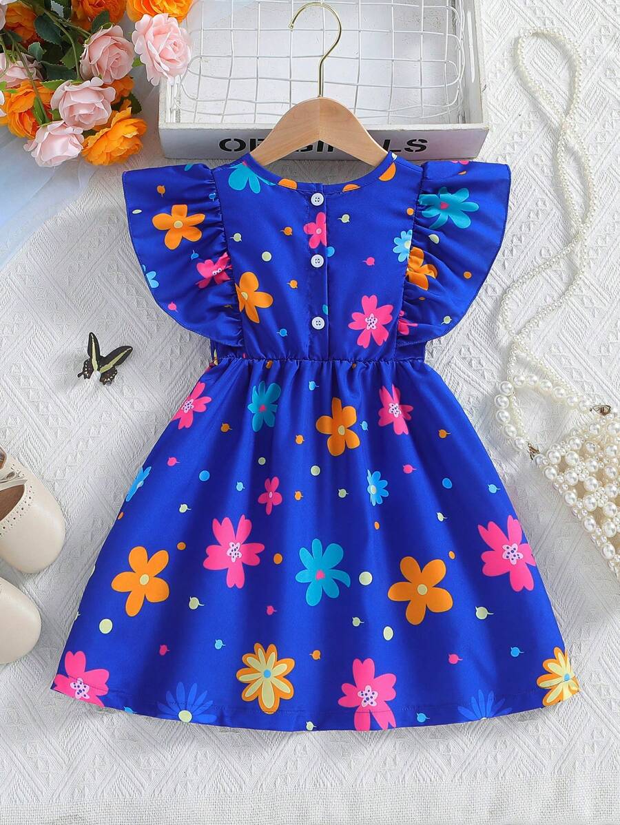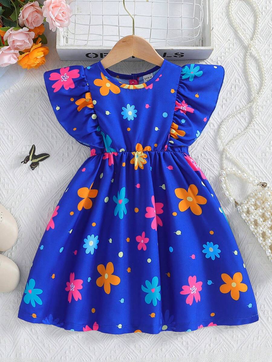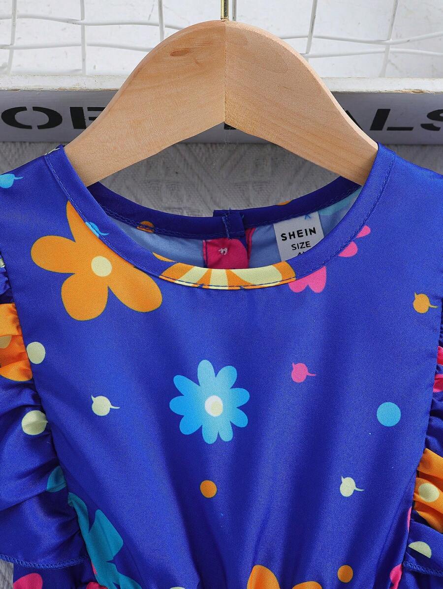 SHEIN Kids SUNSHNE فستان بنات مزين بطبعات الزهور وحاشية مكشكشة للفتيات الصغيرات
