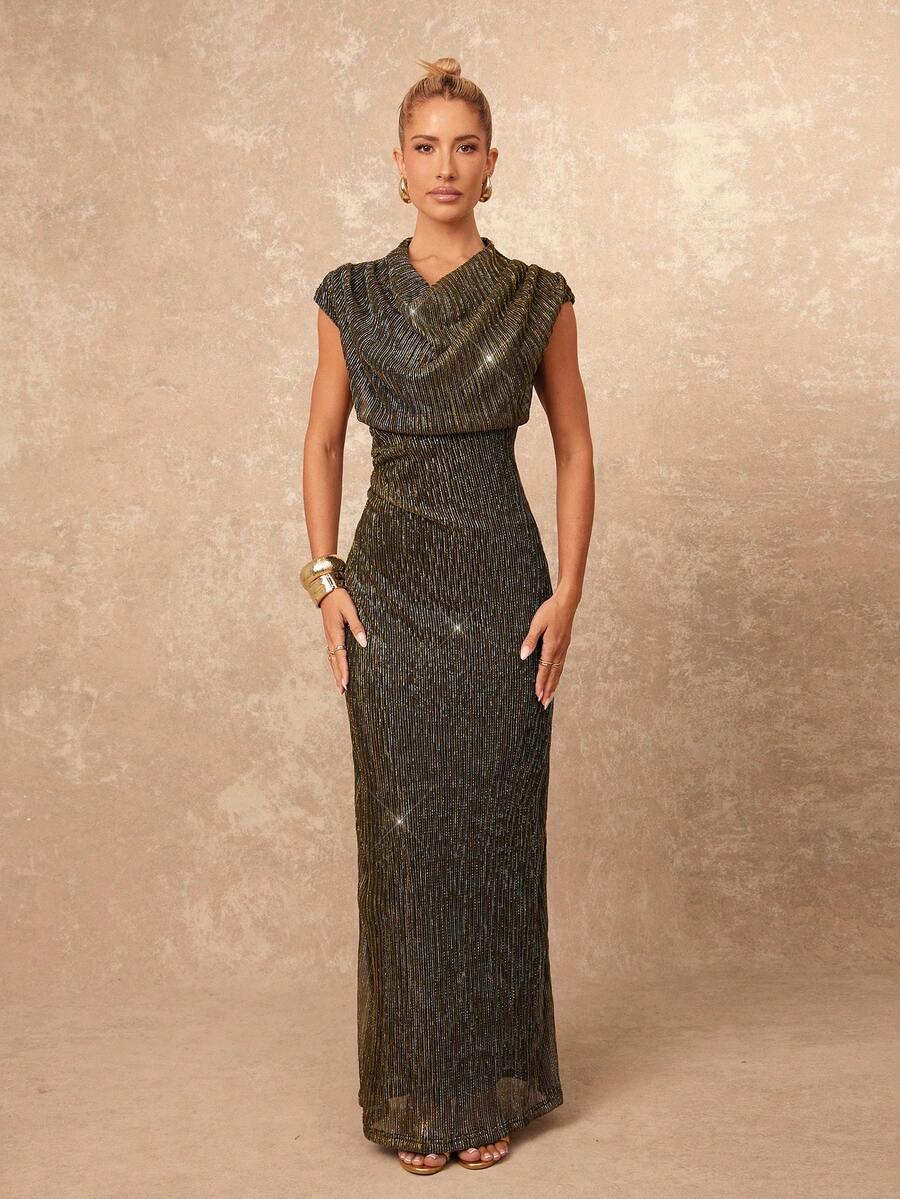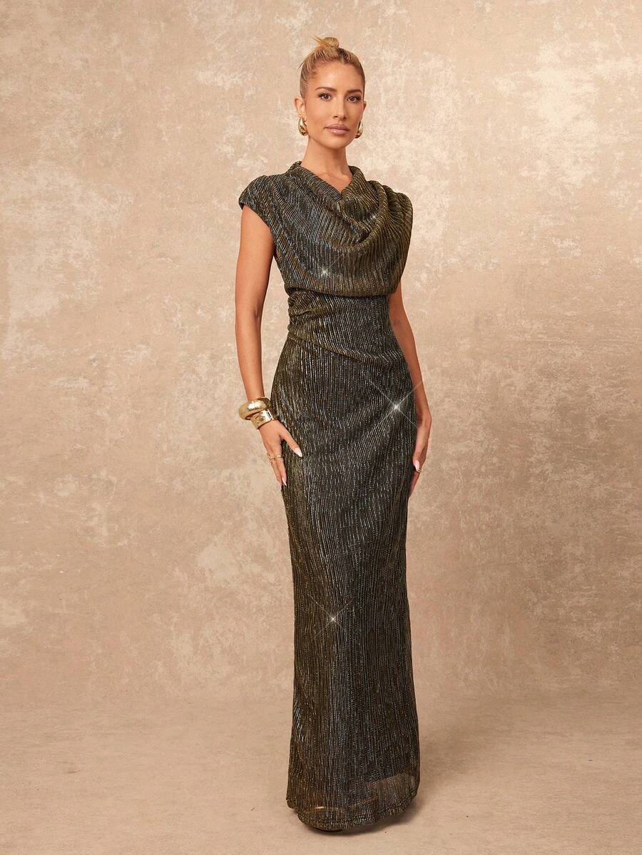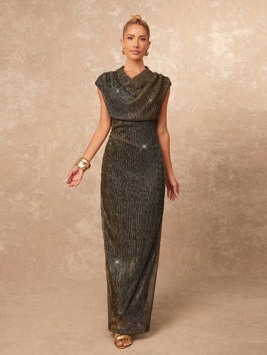 SHEIN Lumalex فستان ذهبي أنيق بخيوط معدنية ذهبية ورقبة متدلية