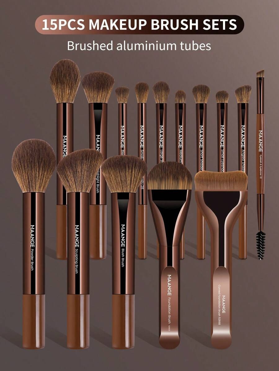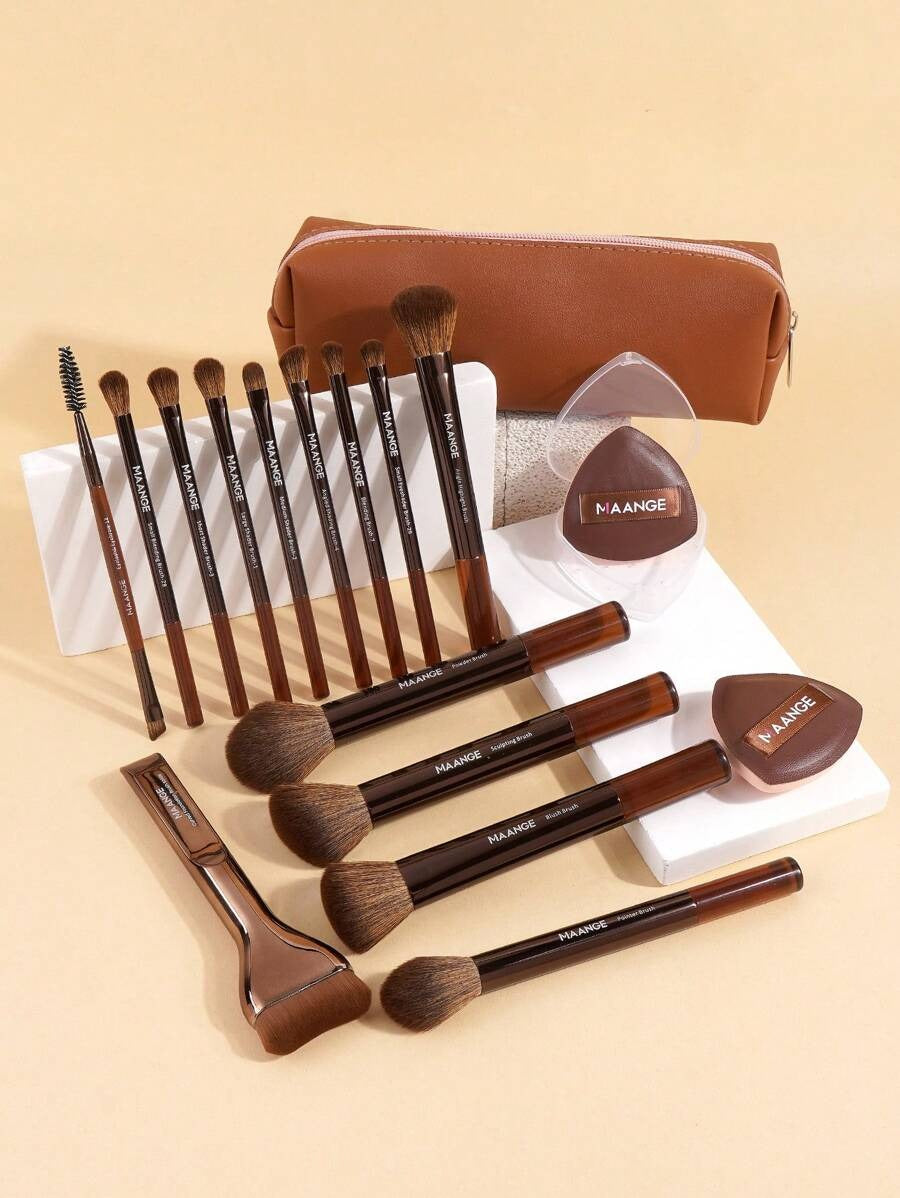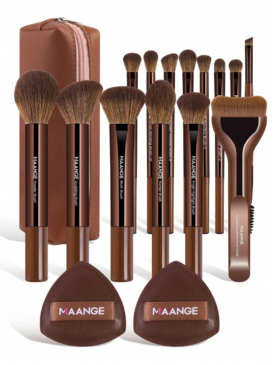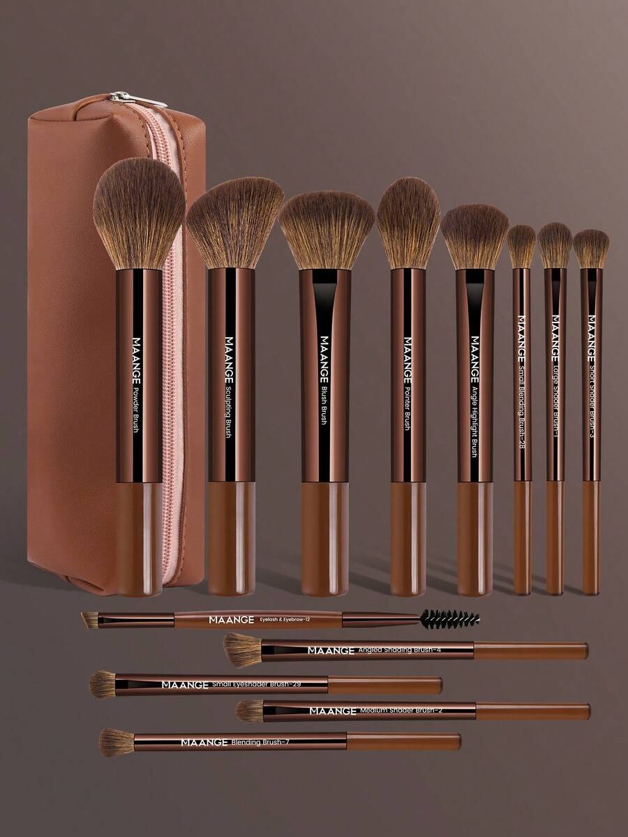 طقم مكياج متكامل فيه فرشاة متنوعة لكل خطوة: الأساس، البودرة، أحمر الخدود، الظلال، الرموش، الحواجب، الشفاه، والهالو، مع قطعتين إضافية واكسسوارات تجميل، الكل يجي في حقيبة أنيقة بلون بني مصدي. الشعر ناعم من النايلون والمقابض من الراتنج، تصميم خفيف وسهل الحمل، مثالي كهدية أو للاستخدام اليومي.