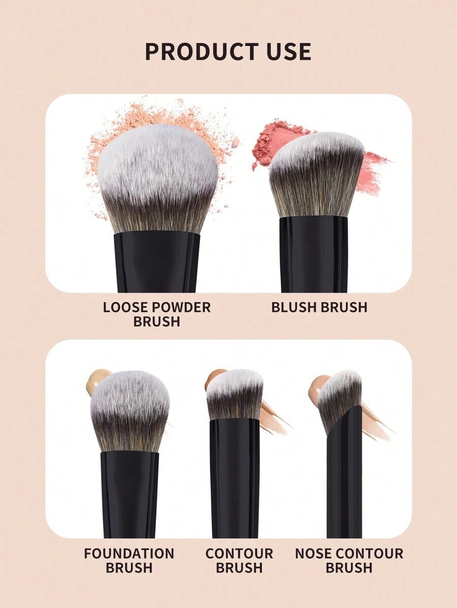 مجموعة مكياج أساسية مكونة من ٥ فرش ناعمة، تشمل فرشاة بودرة مفتتة، فرشاة أحمر خدود، فرشاة فاونديشن، فرشاة تحديد وجه، وفرشاة تحديد الأنف. مصنوعة من ألياف ناعمة وخفيفة على البشرة، مع مقابض خشبية أنيقة. تجي بحقيبة عملية، مثالية للسفر أو كهدية 🎁