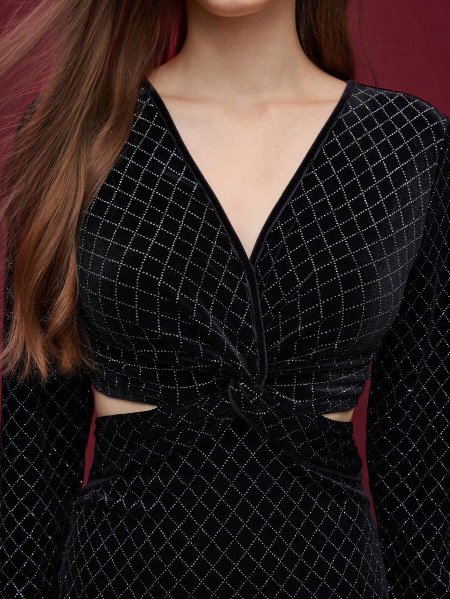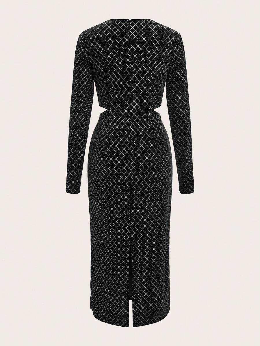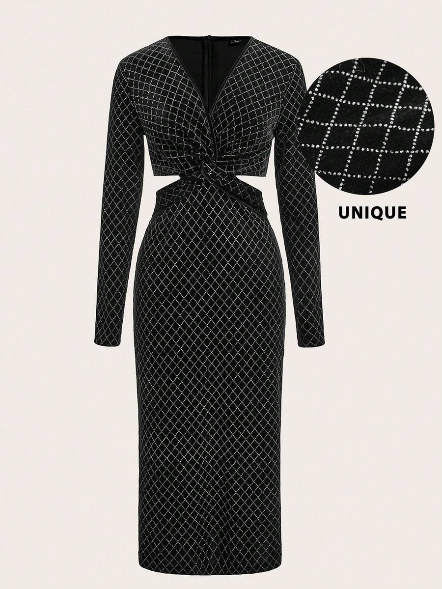 فستان مخمل أنيق بياقة على شكل حرف V وتصميم مربعات عصري، بأكمام طويلة وخصر ملتوي مع فتحات أنيقة