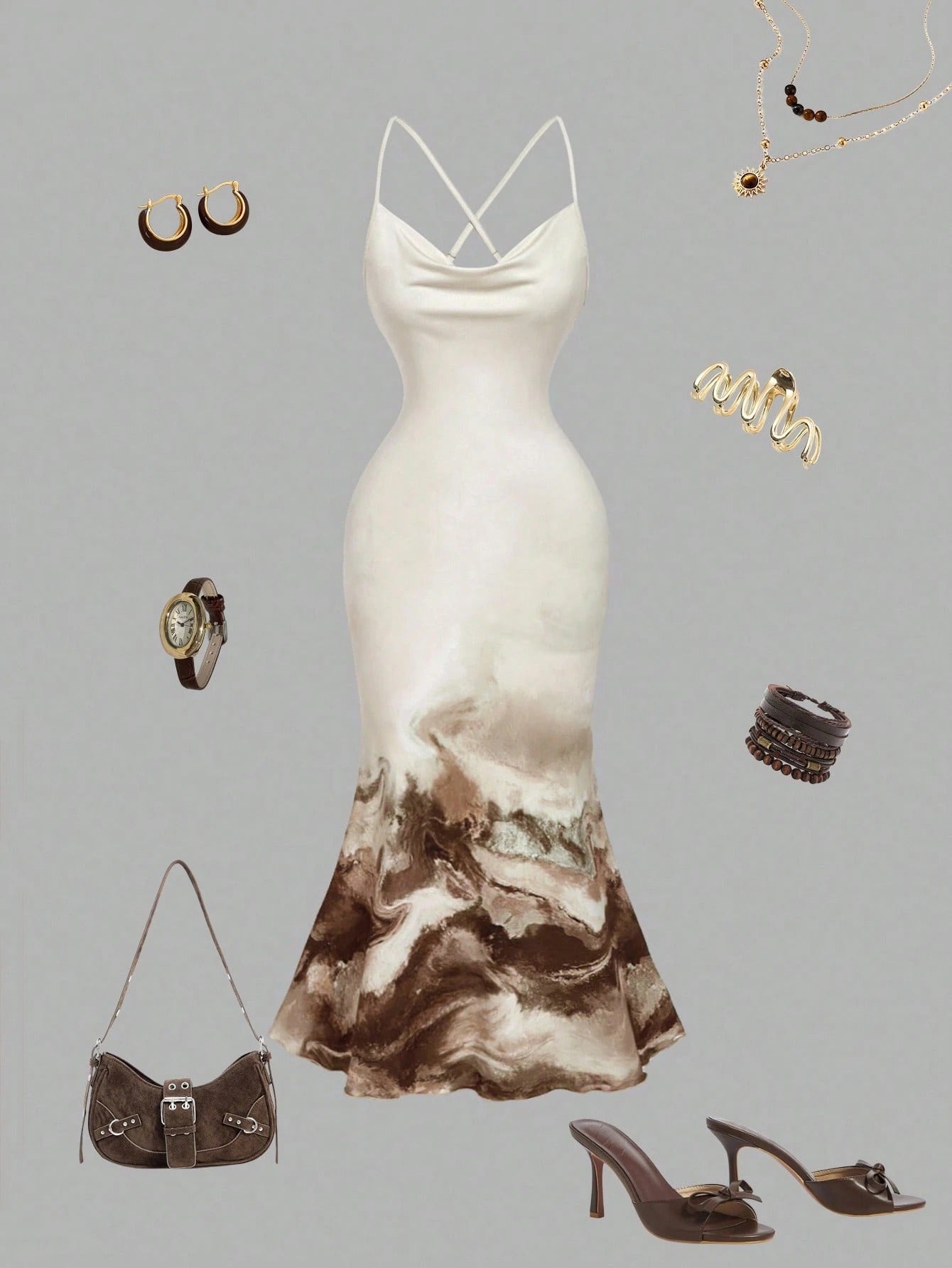 تنورة جذابة بقصة ذيل السمكة وتصميم كامي مع رقبة عميقة وأشرطة سباغيتي، مثالية لإطلالات مثيرة ومواعدة.