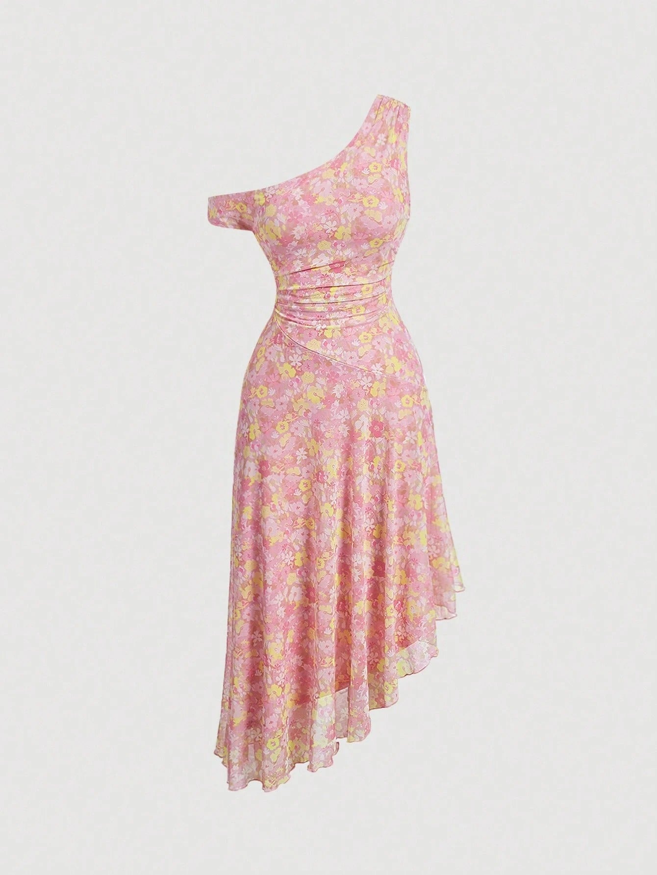 فستان ميدي أنيق بقصة A مع ياقة وحافة غير متماثلة، مزين بطبعة زهور شاملة وطيات دقيقة.