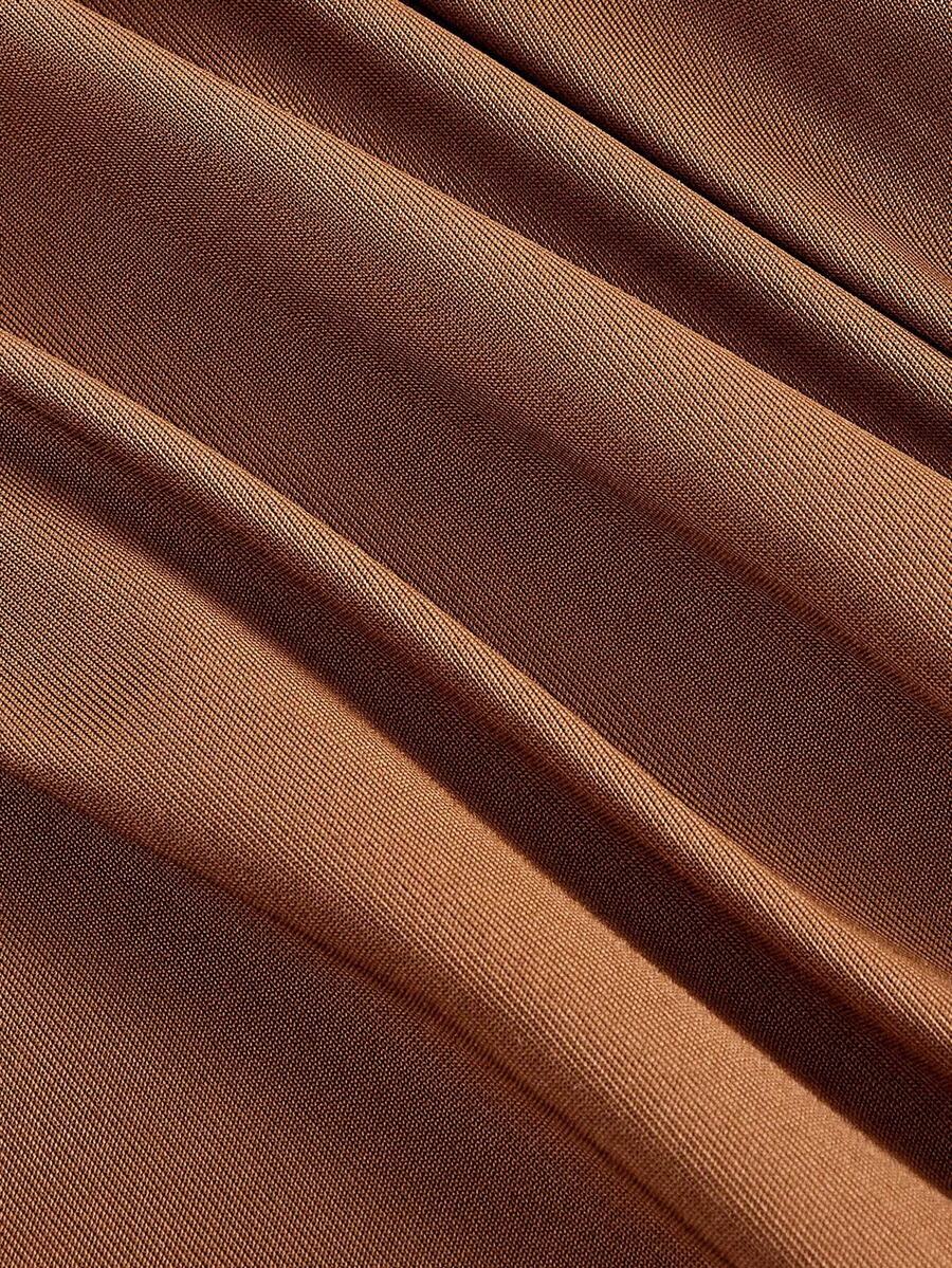 فستان متوسط الطول باللون البني مع أكمام شبكية مزدوجة وتصميم مستوحى من سبعينيات القرن الماضي، مثالي لحفلات الزواج والمواعدة.