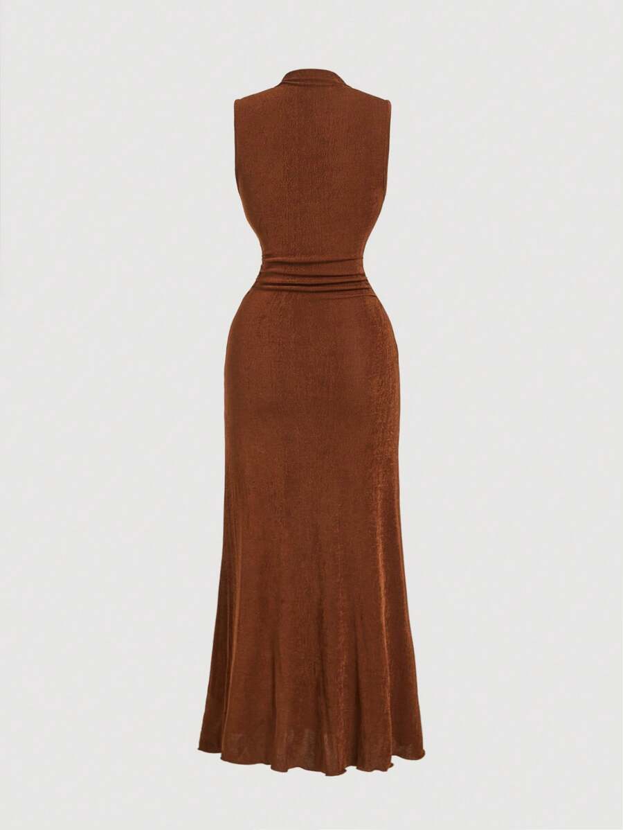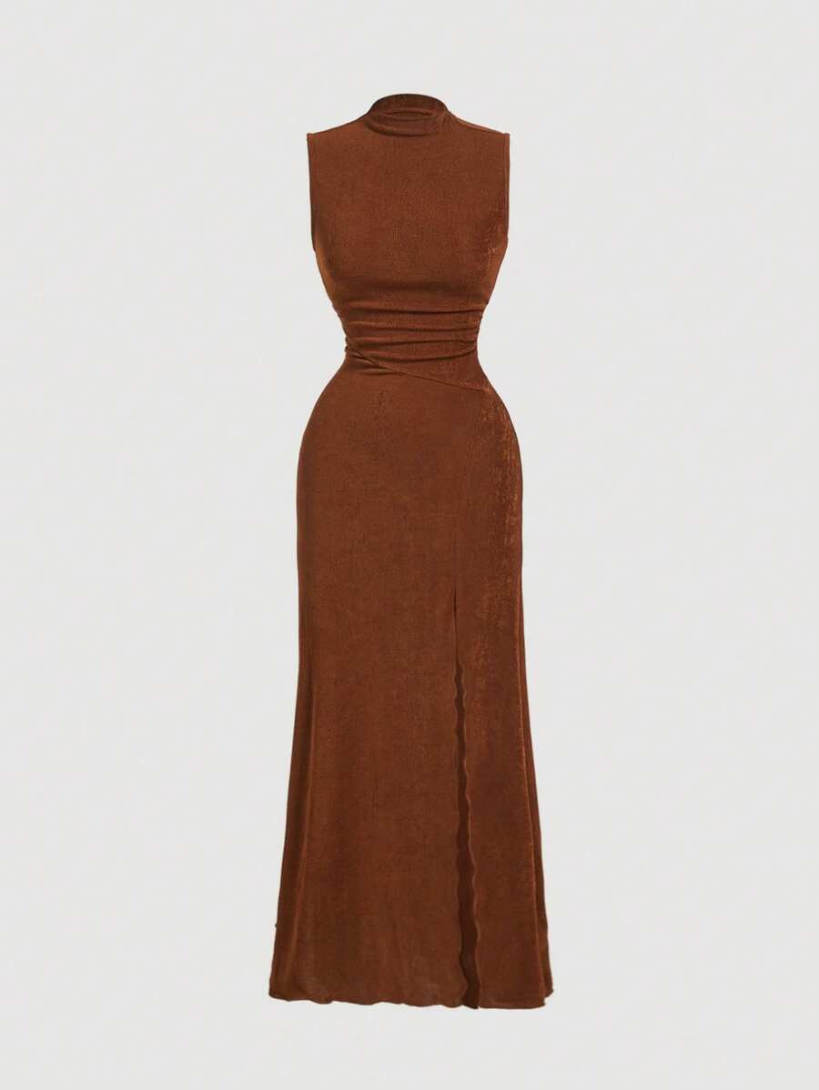 SHEIN MOD فستان بني بفتحة عالية وياقة واقفة
