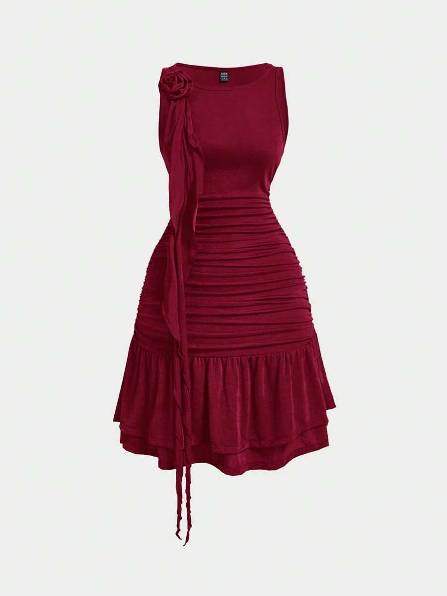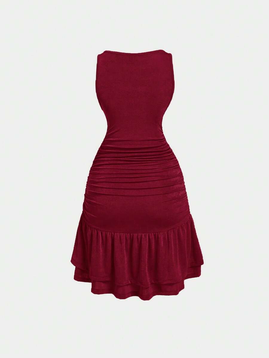 SHEIN MOD فستان عنابي لامع بلا أكمام بكشكشة وحاشية غير متماثلة
