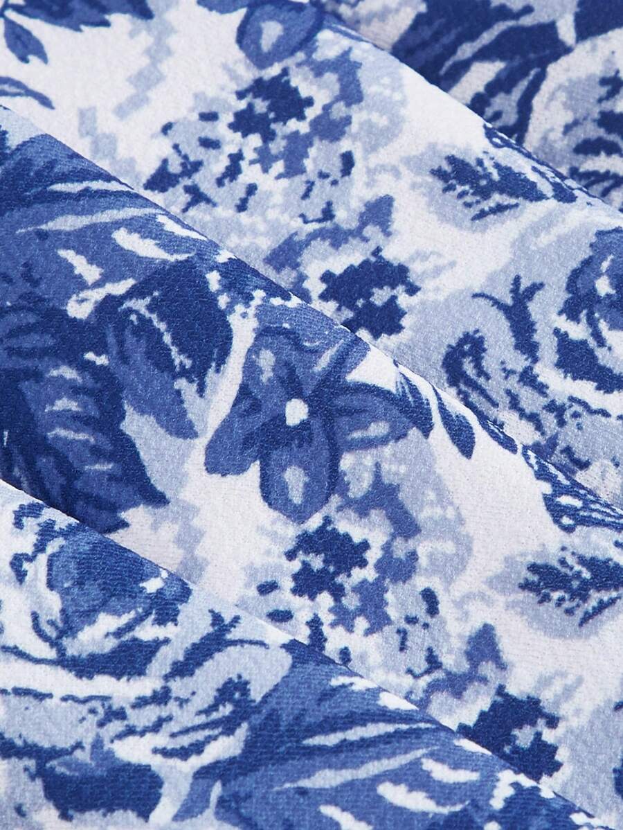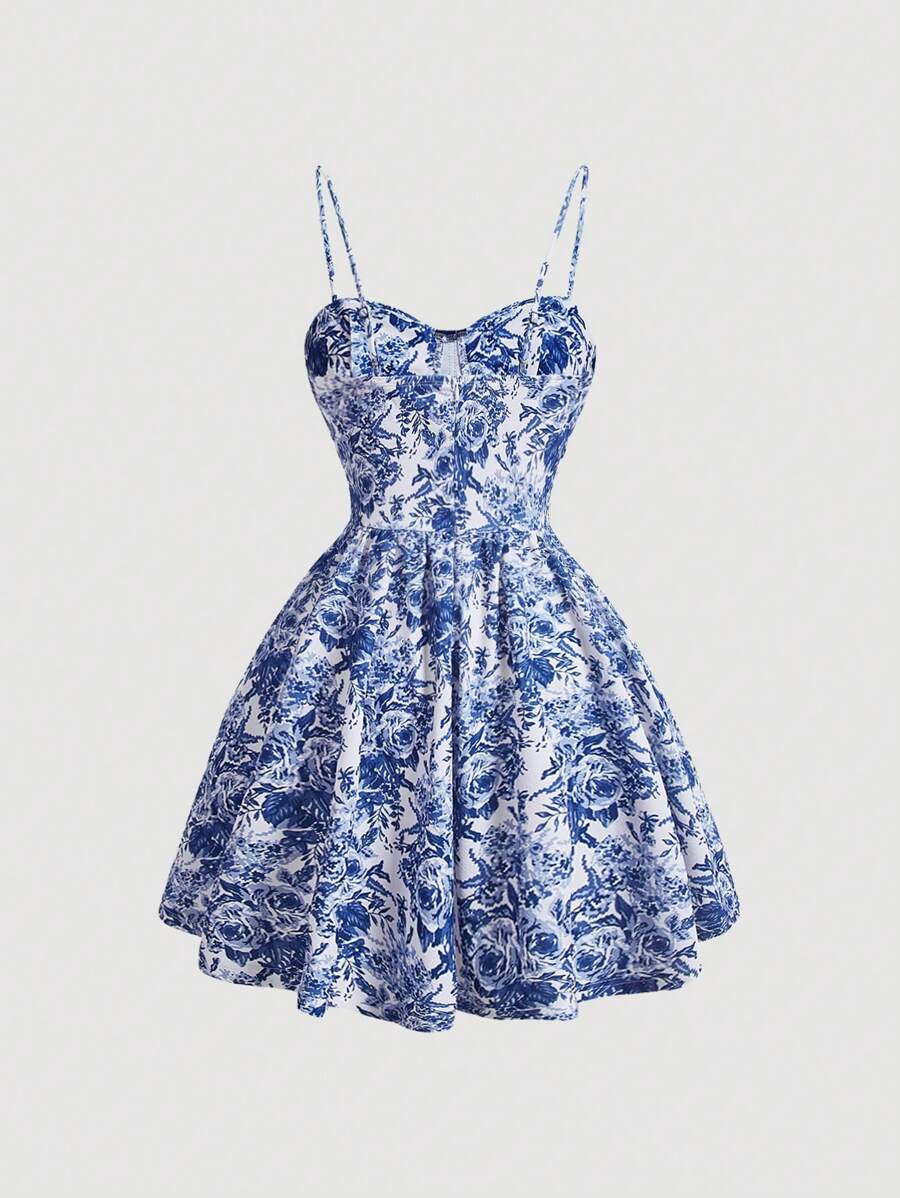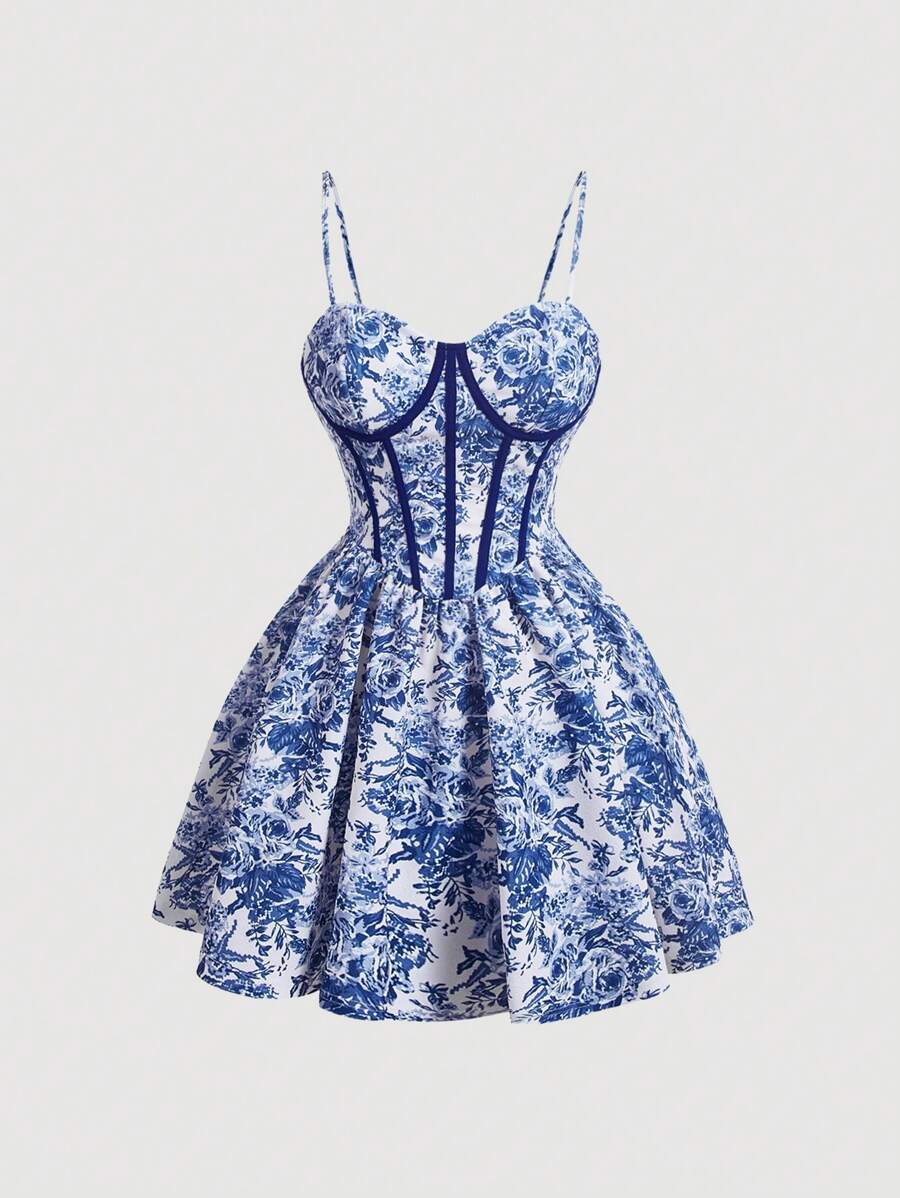 فستان قصير أنيق بتباين أزرق وأبيض وطباعة زهرية، مثالي لموسم التخرج.