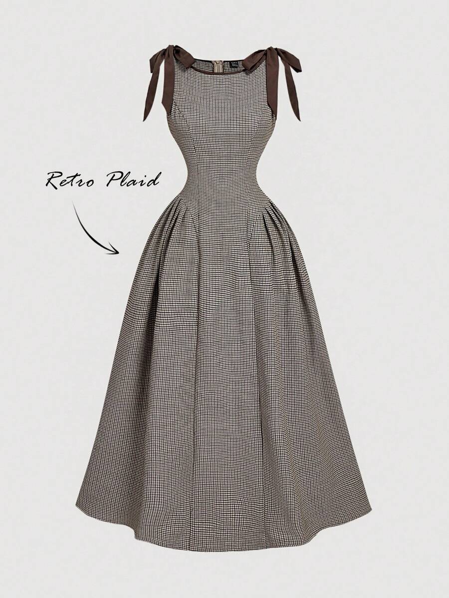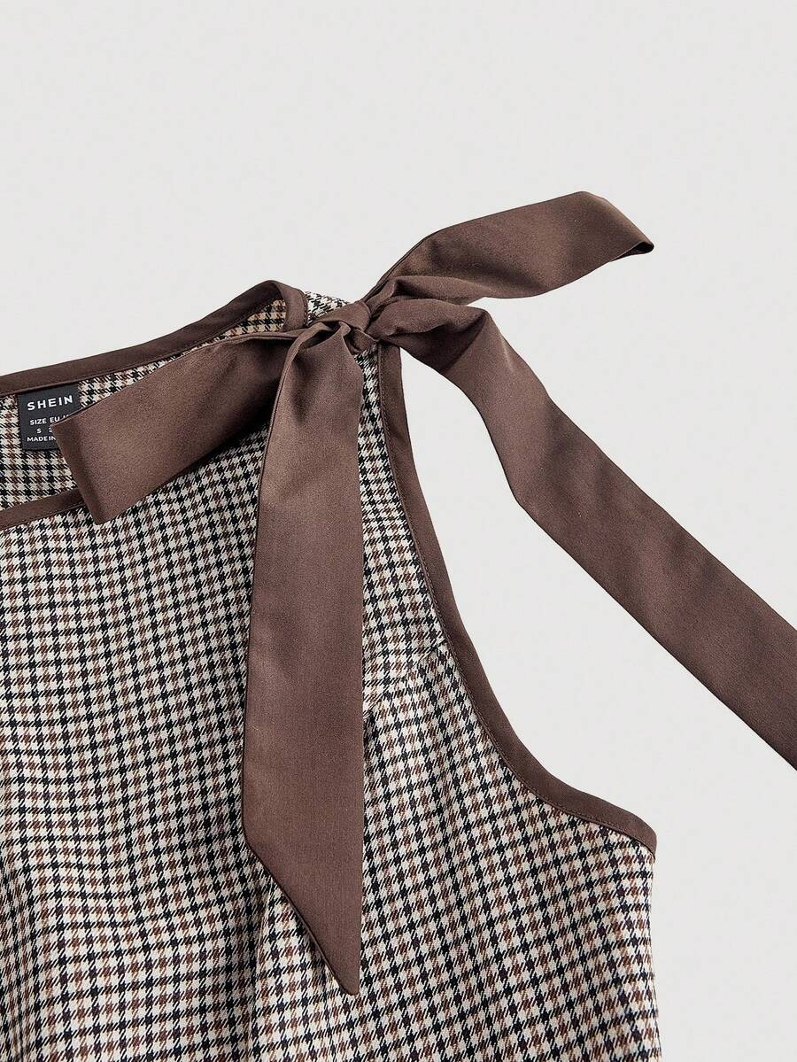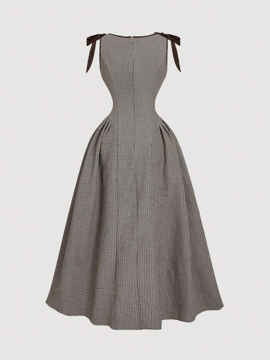 SHEIN MOD فستان كاروهات بياقة مستديرة بلا أكمام وفيونكة على الخصر