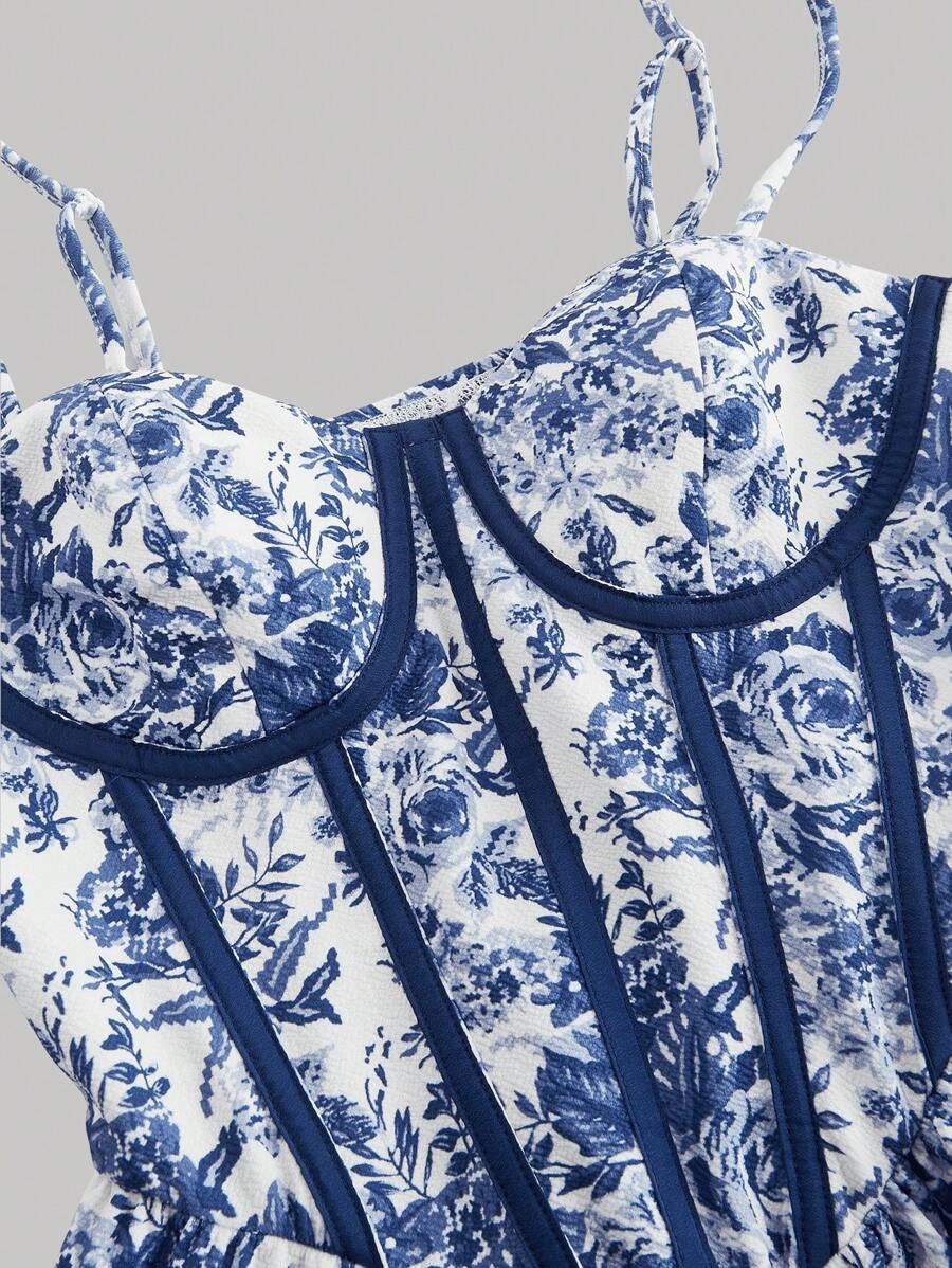 SHEIN MOD فستان بنمط مزهري بلونين أزرق وأبيض بخصر محدد