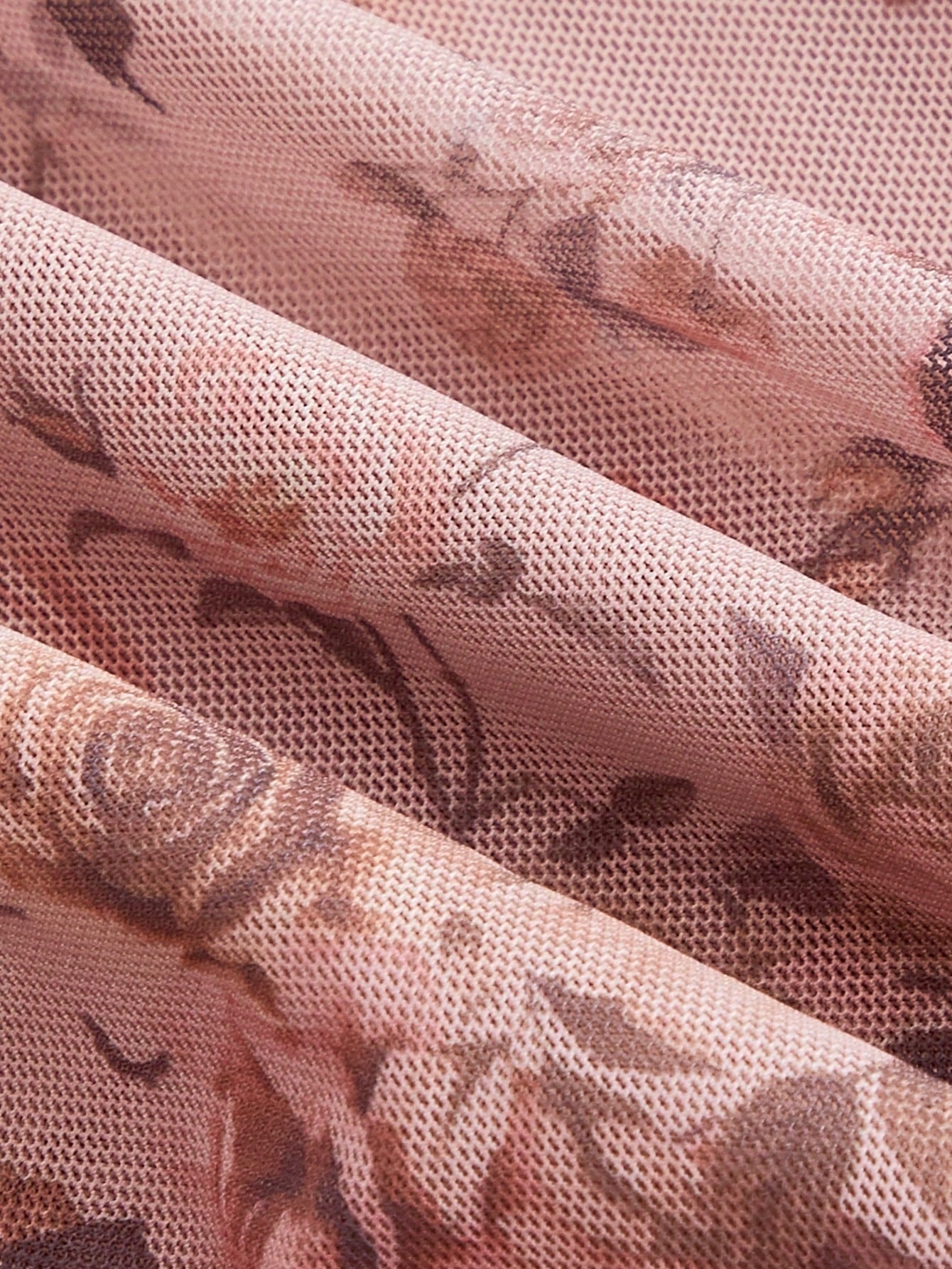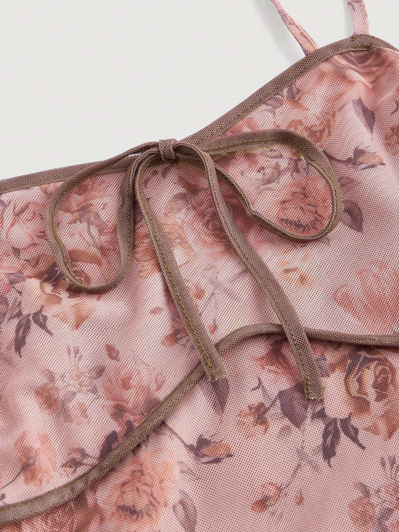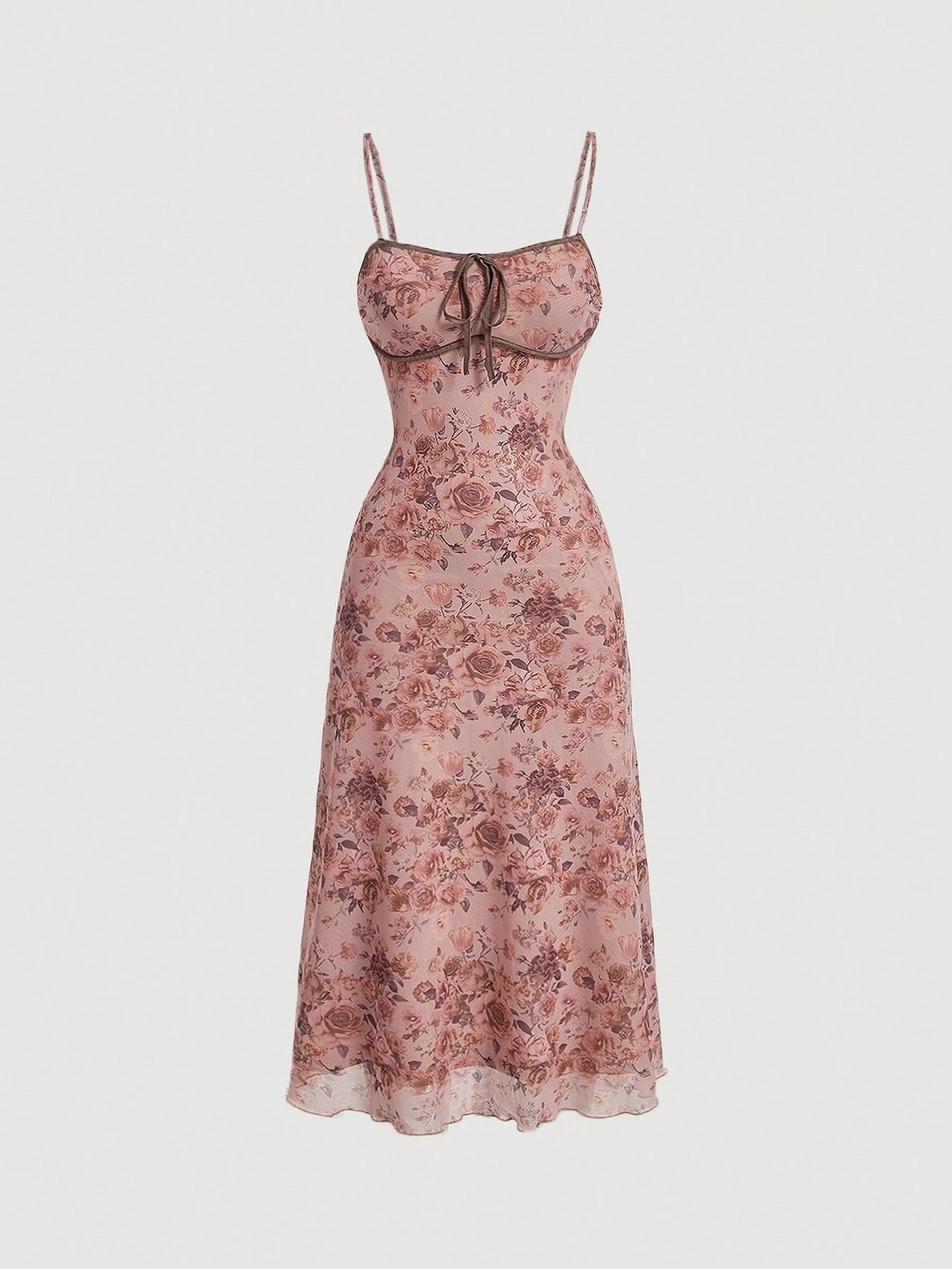 فستان ميدي أنيق بقصة كامي وكتف مكشوف، مزين بطبعة نباتية فاخرة مع مشد متباين ورباط خلفي وطيات صدر .