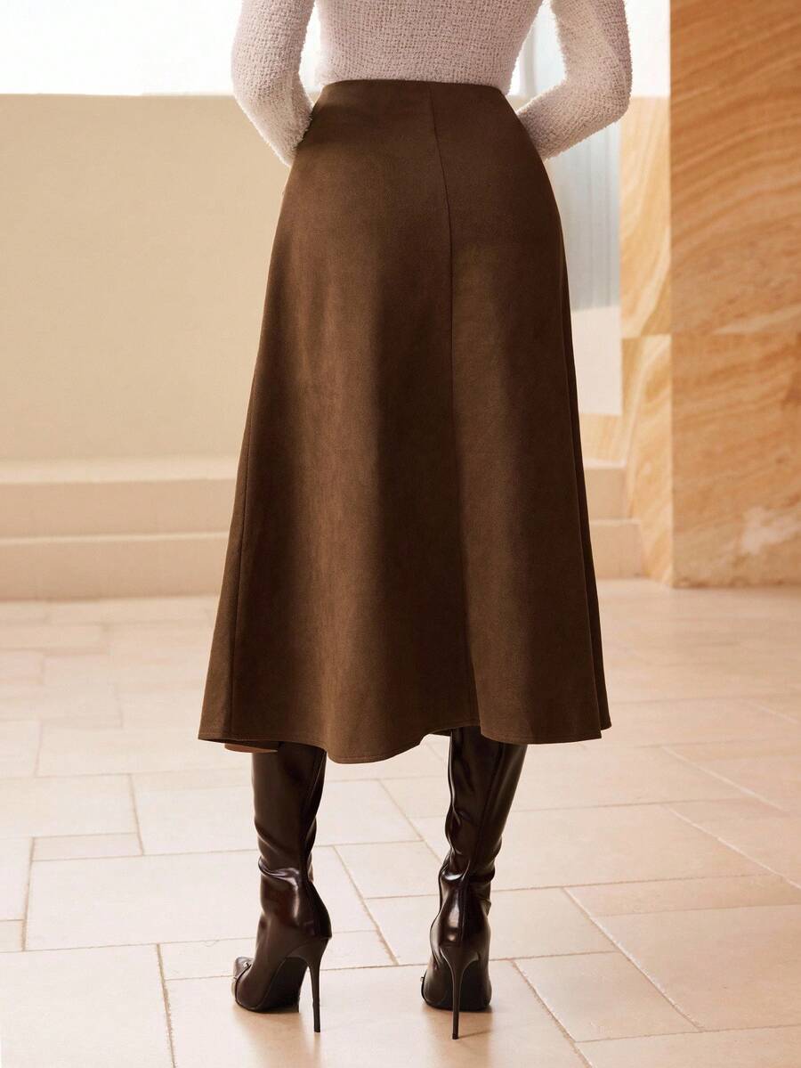 SHEIN Modelyn تنورة بنية طويلة من الجلد المدبوغ المخملي