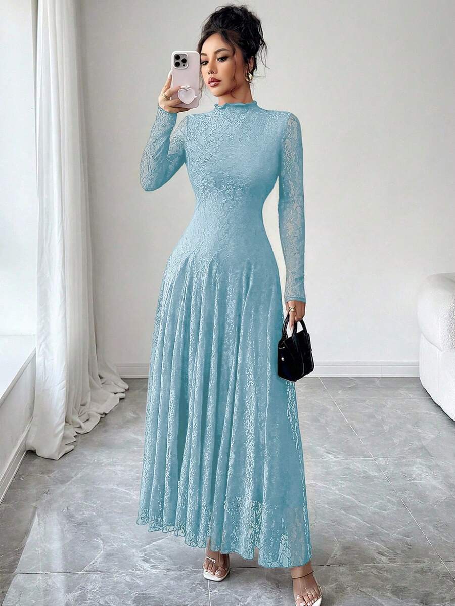 SHEIN Modelyn فستان أزرق بياقة عالية وخصر مشدود بالدانتيل