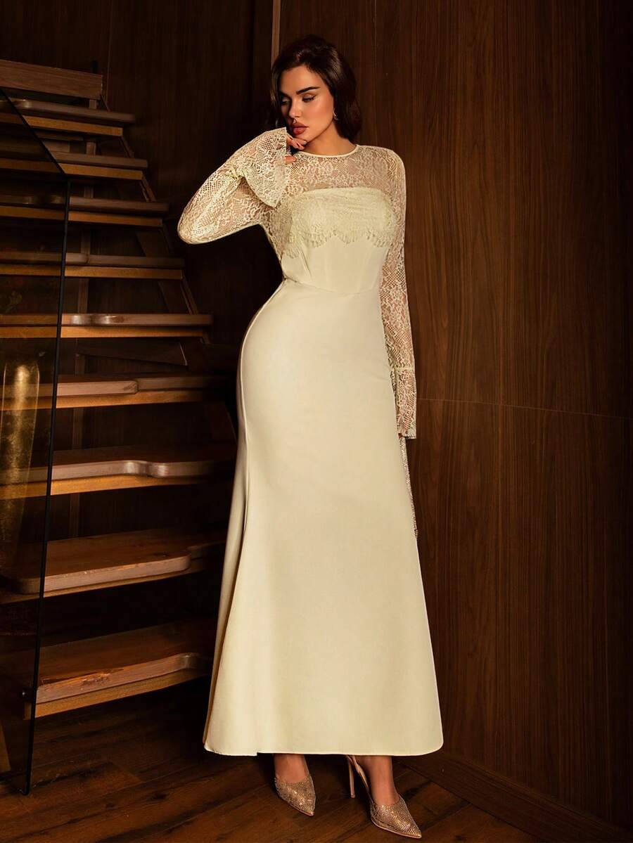 فستان طويل أنيق من Modelyn بتصميم A شكل بدون أكتاف، مزين بالدانتيل وشبكة متباينة مع خصر مشدود، مثالي لإطلالة رسمية ومسائية أنثوية وجذابة