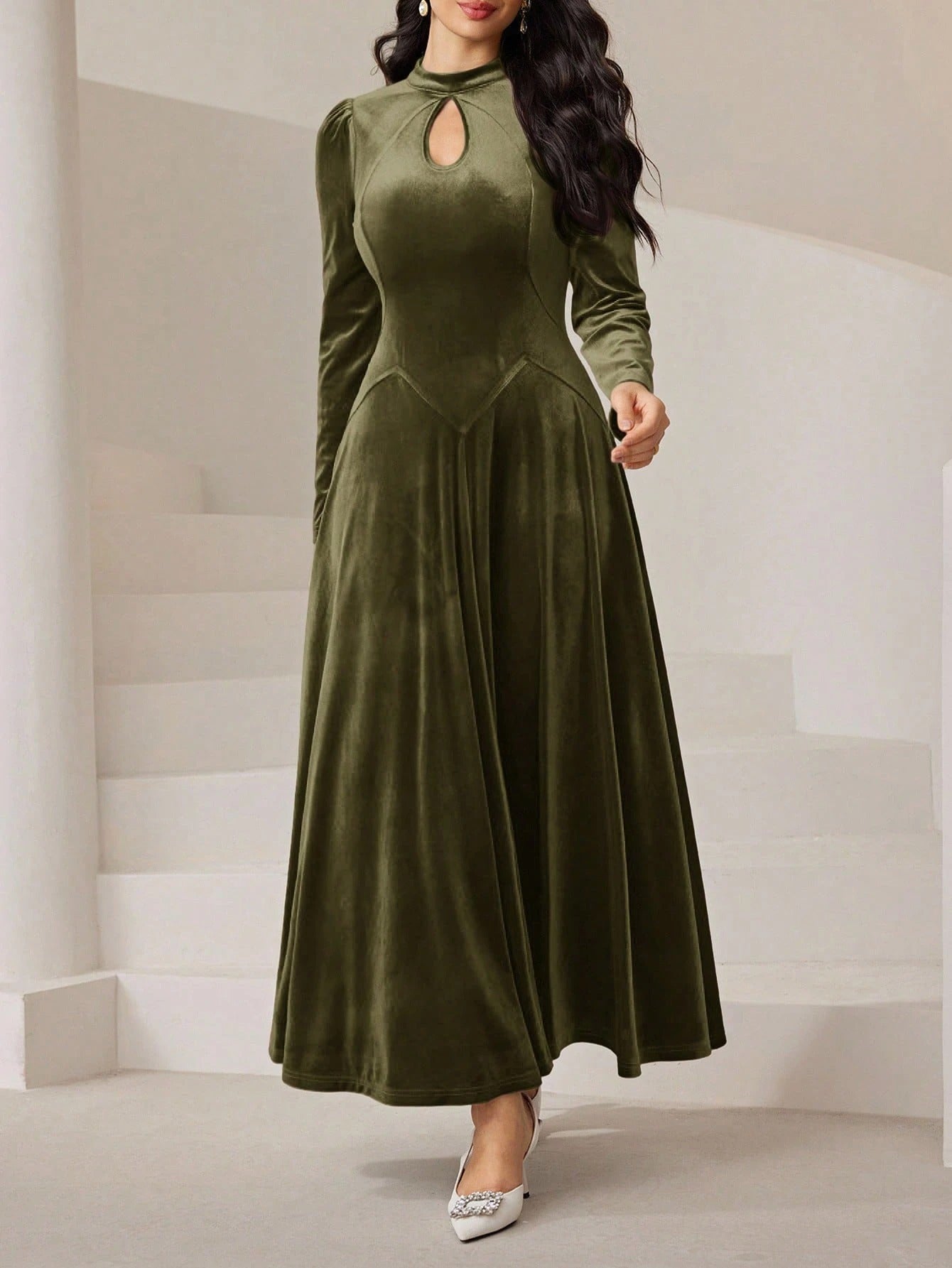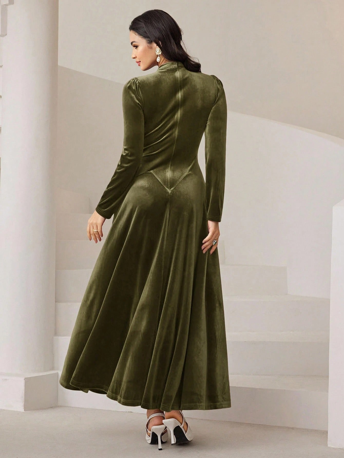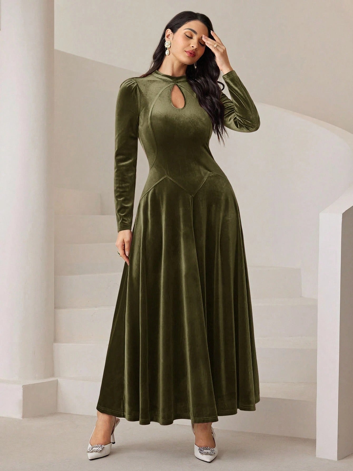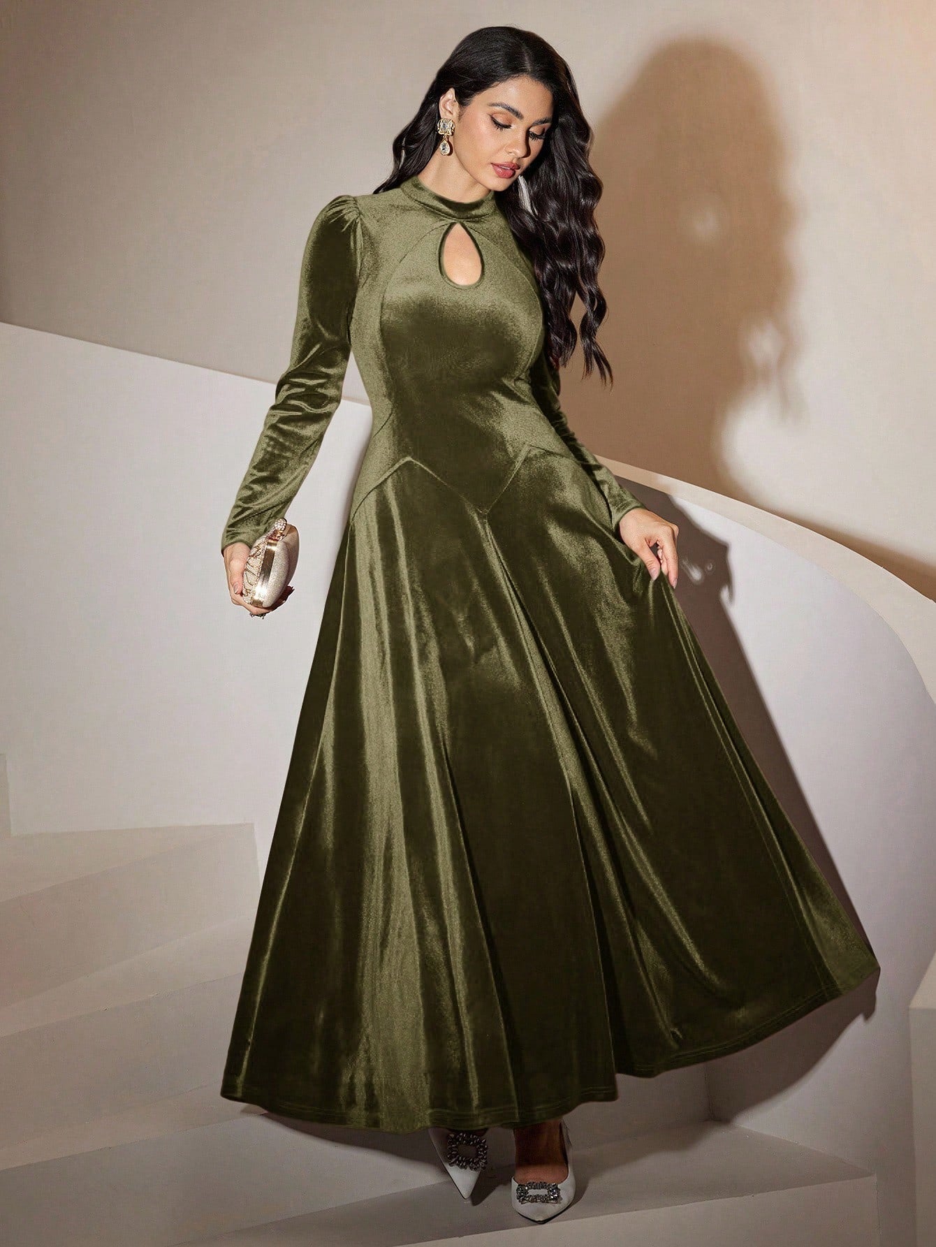 SHEIN Modelyn فستان سهرة طويل اخضر زيتون بياقة مفتوحة وأكمام منتفخة
