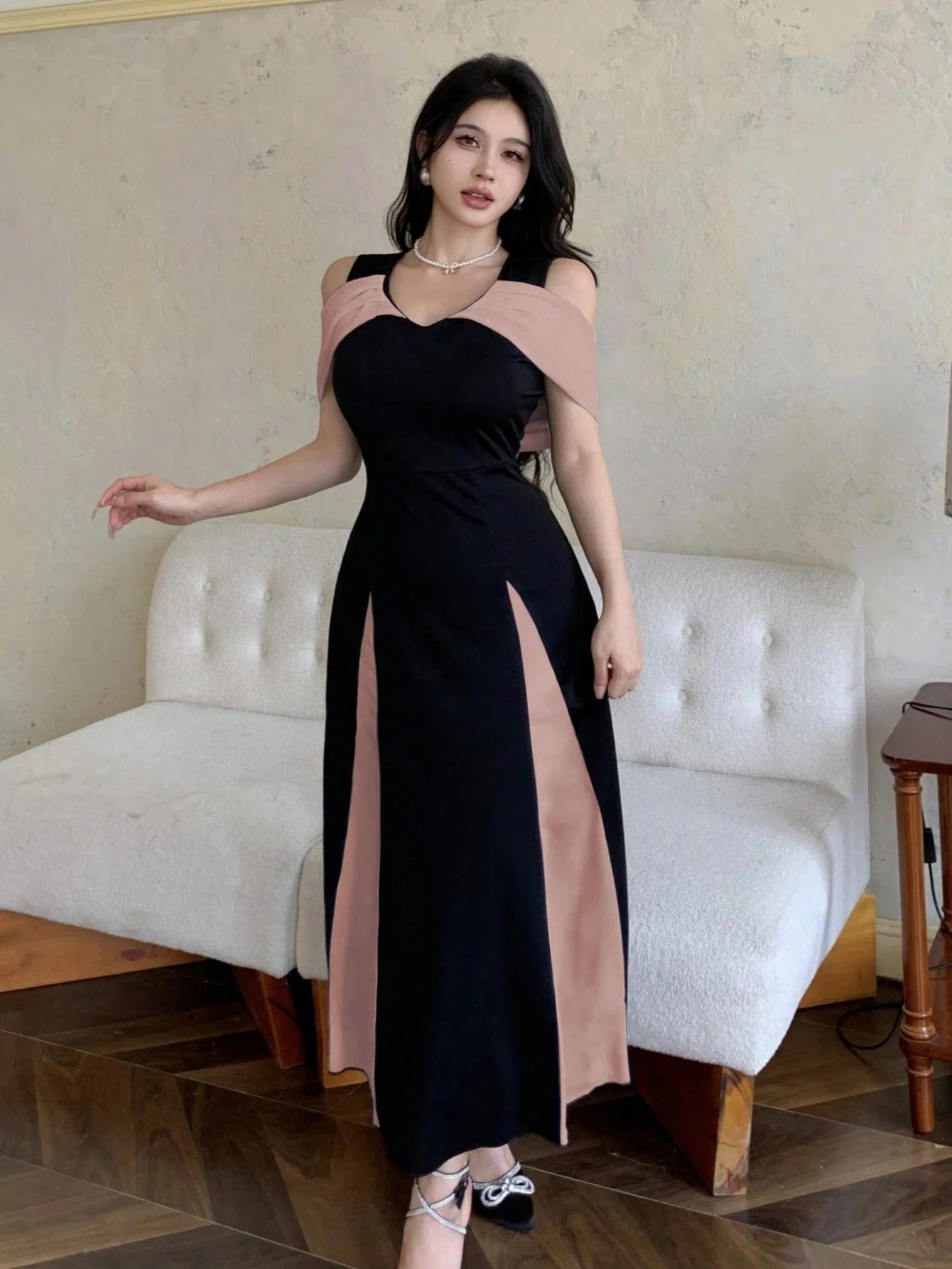 SHEIN Modelyn فستان مبطن مكشوف الكتف بلون مزدوج بحافة كروشيه أنيق