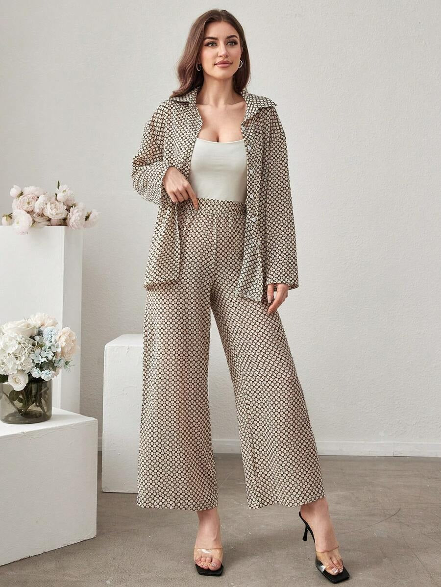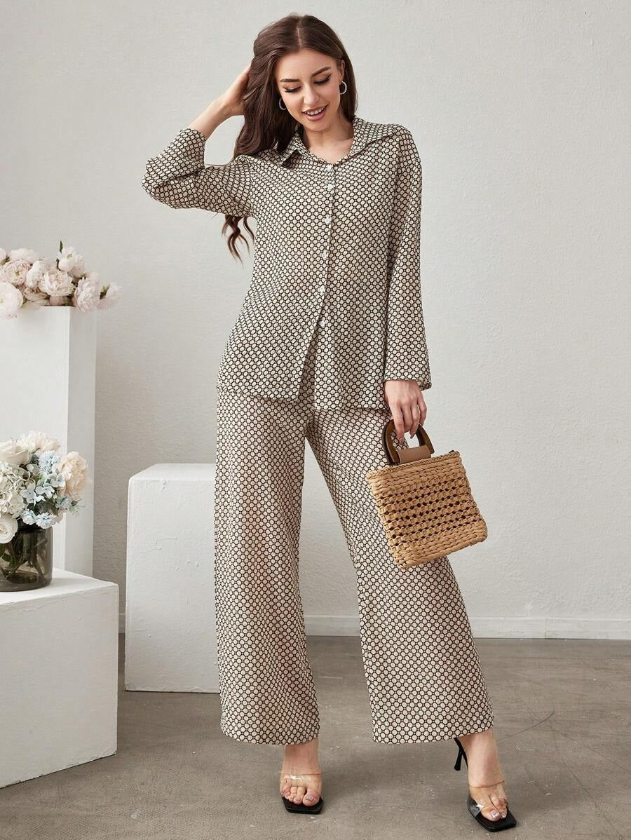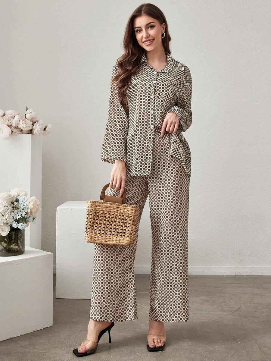 طقم مكون من قميص بأكمام طويلة وياقة، مع بنطلون بلون كاكي. التصميم بطباعة هندسية كاملة، والقماش مريح ومرن.