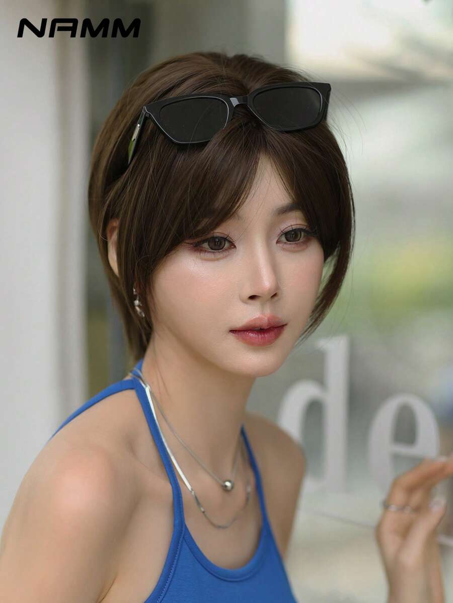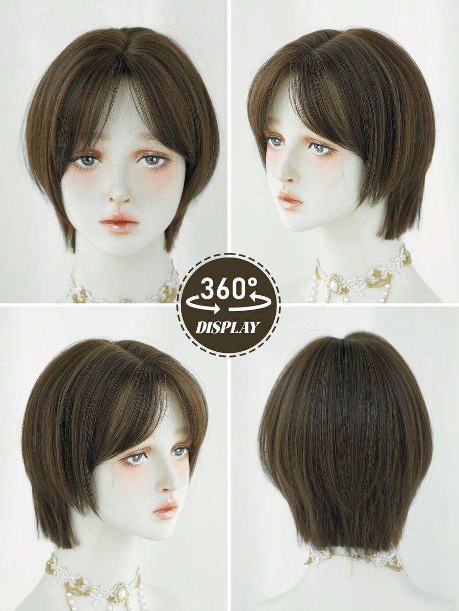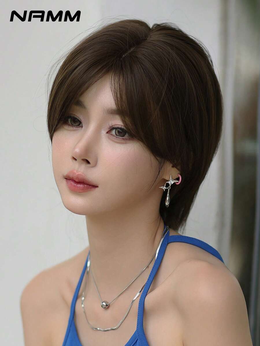 SHEIN NAMM باروكة شعر مستقيم بني قصير 12 بوصة ألياف صناعية مقاومة للحرارة
