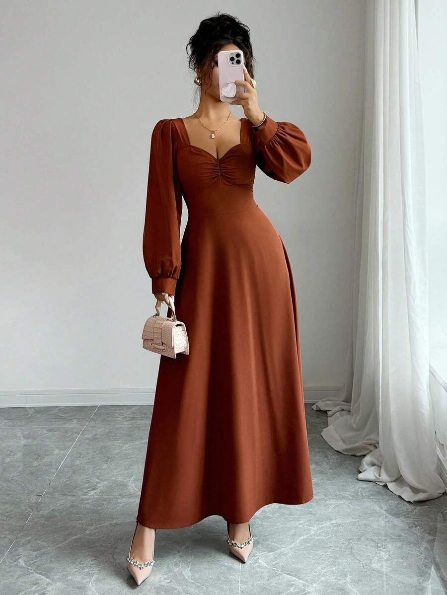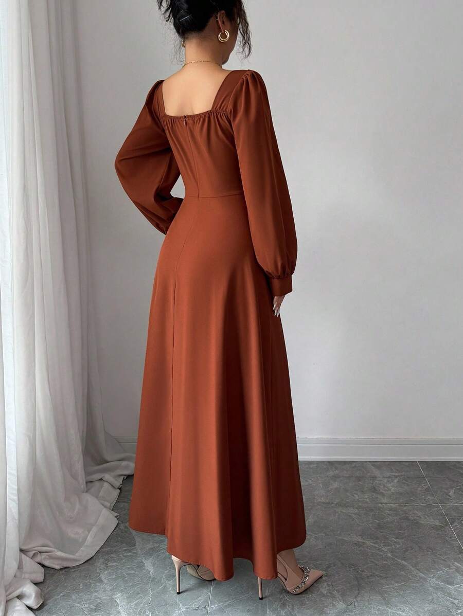 SHEIN Elenzga فستان ماكسي بني بياقة مربعة وأكمام منتفخة