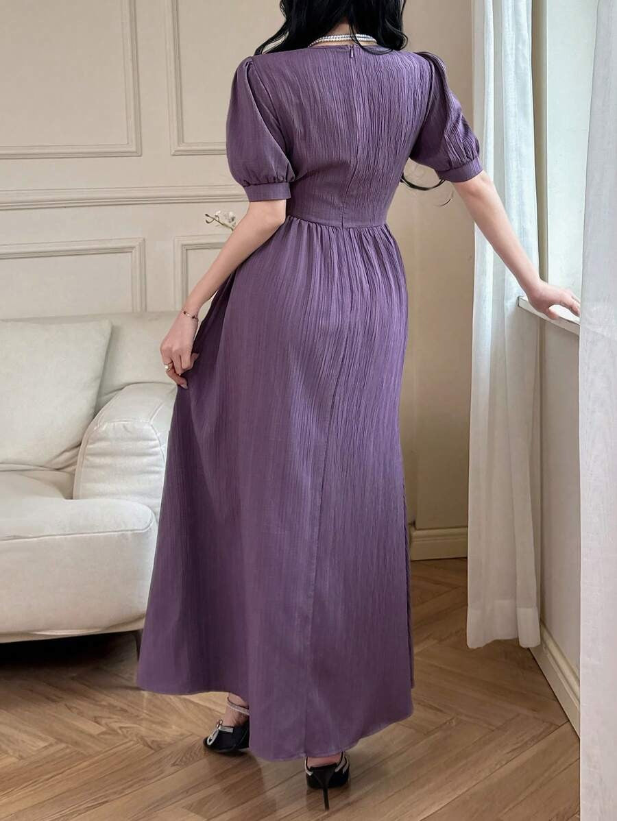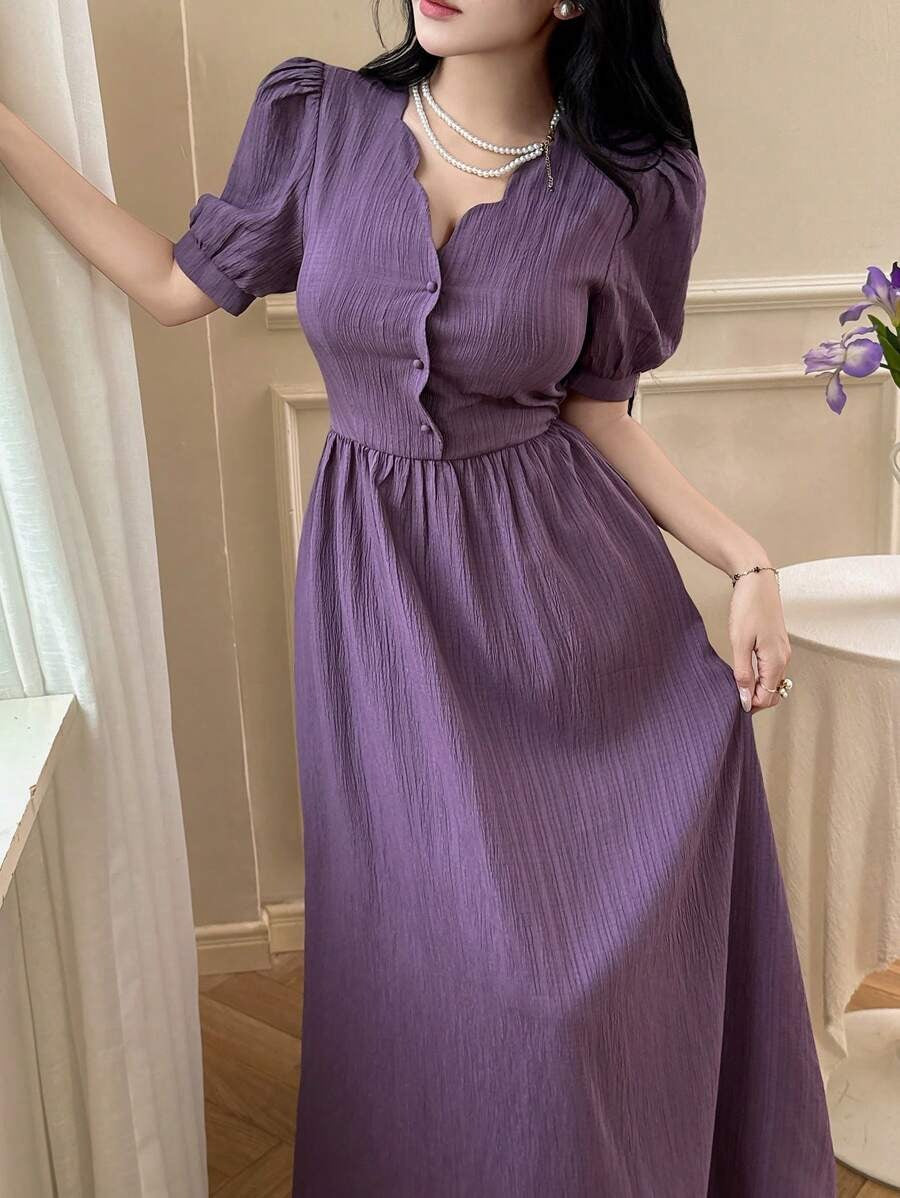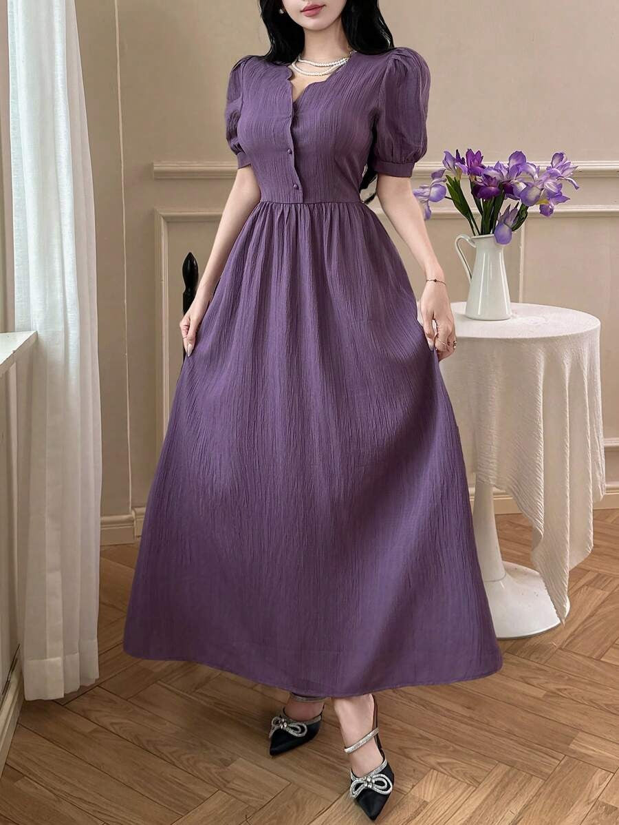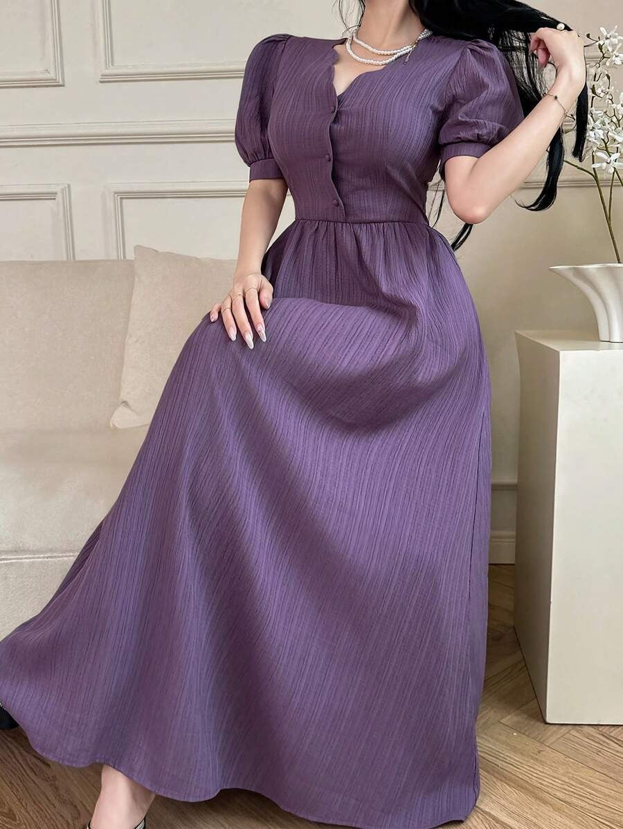 💜 فستان أنيق بلون أرجواني بأكمام منتفخة