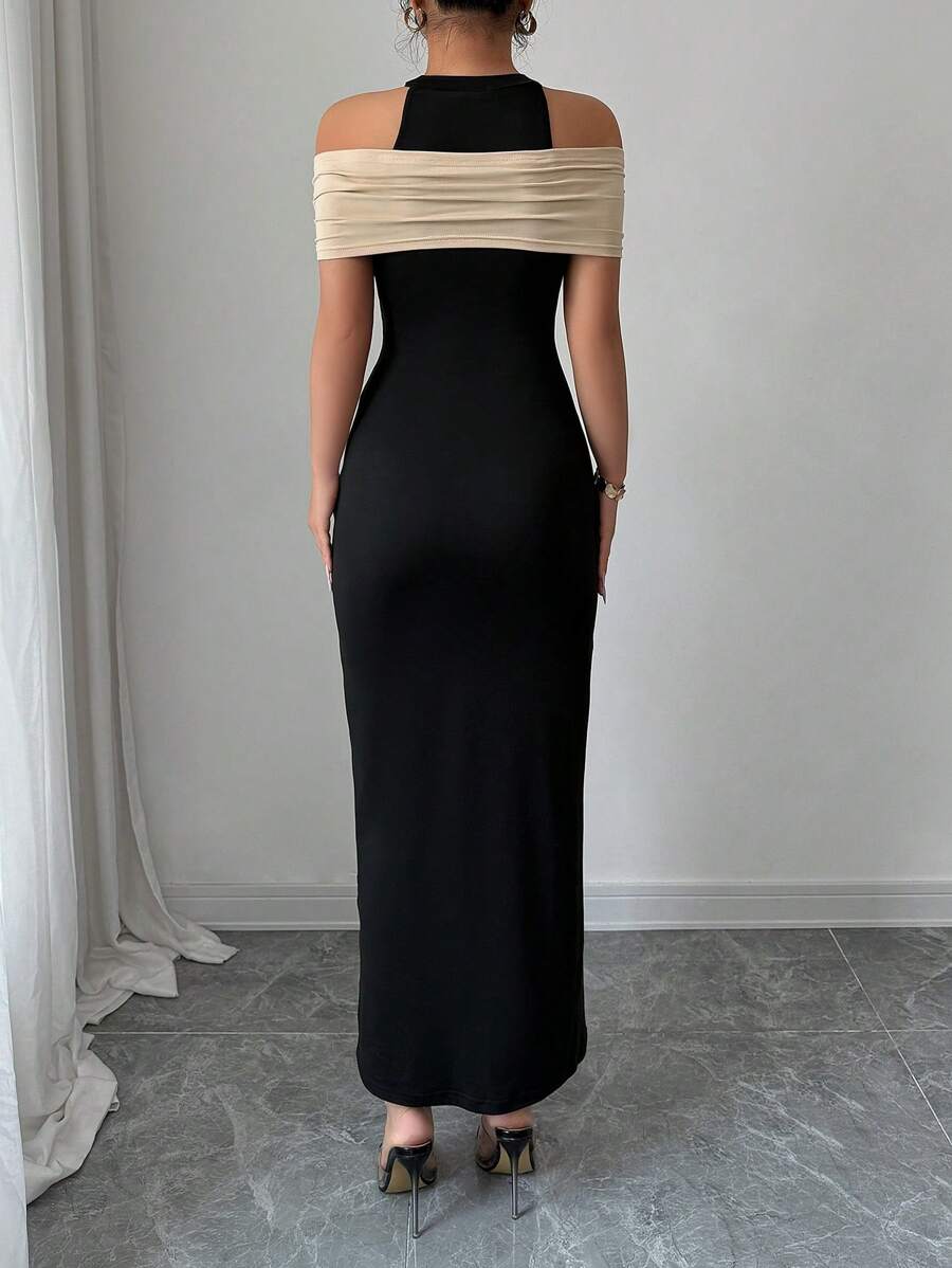 SHEIN Rafferiza فستان أسود وبيج مفتوح من الخلف بشق عالي
