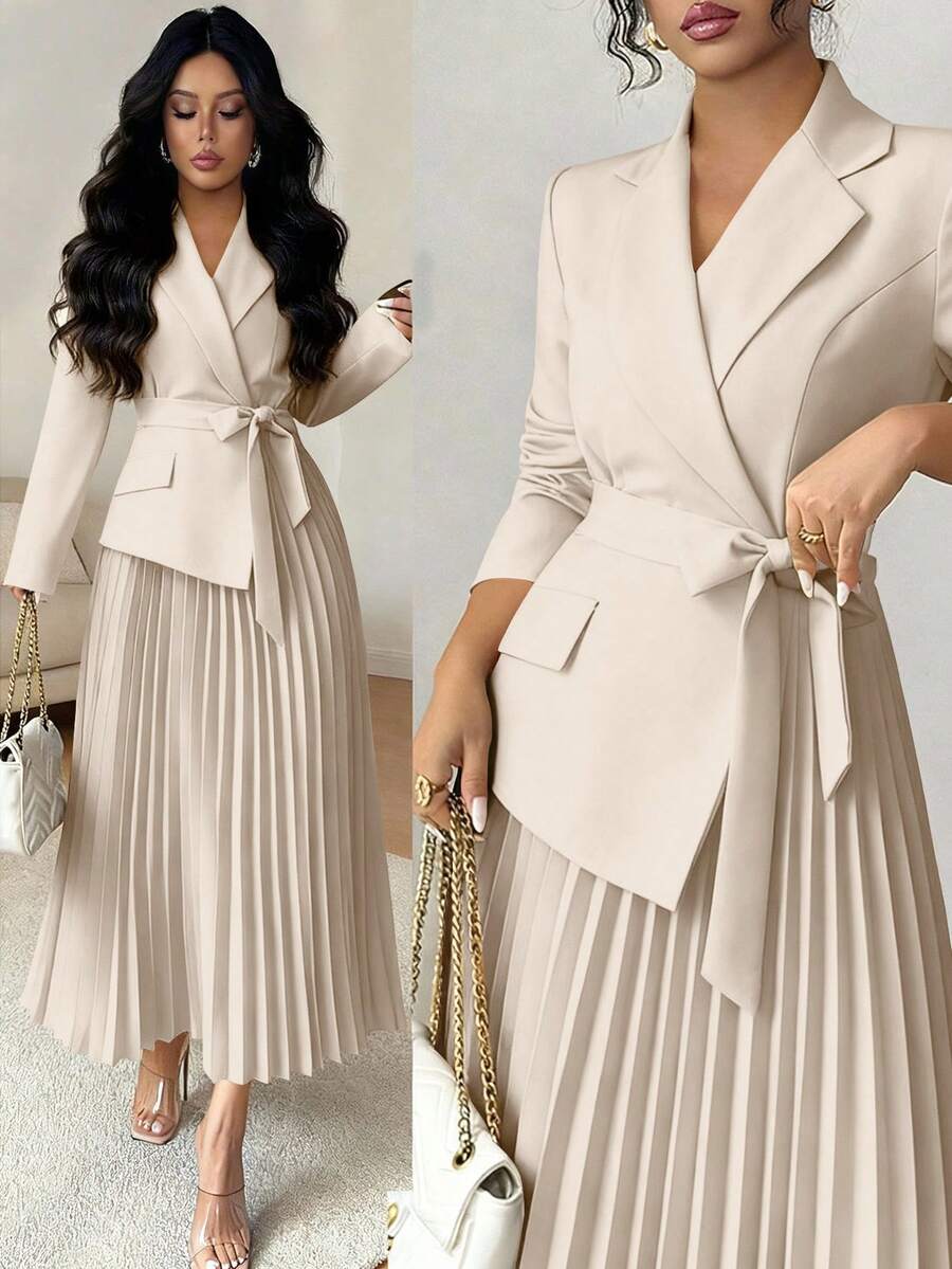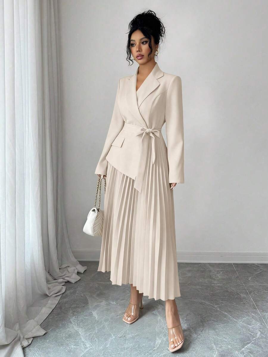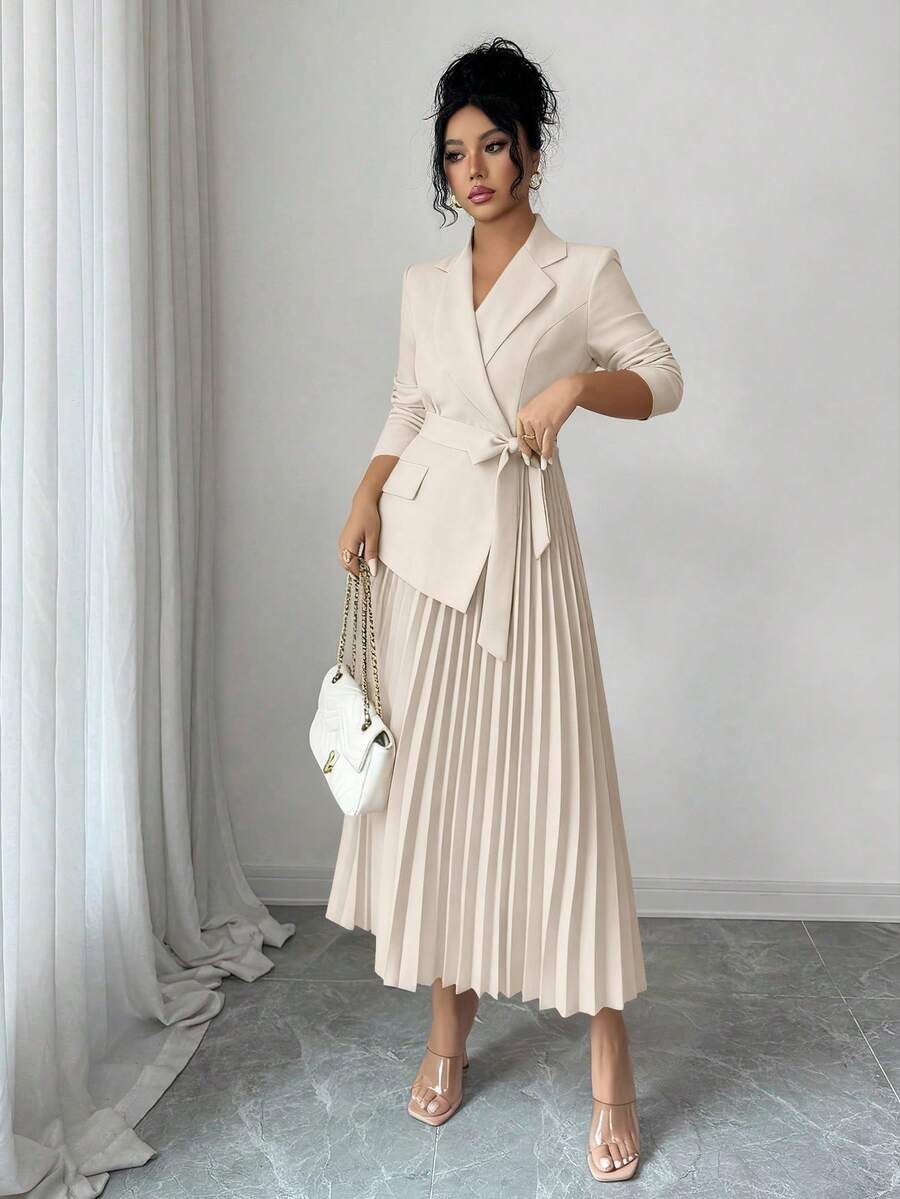 SHEIN Rafferiza فستان كاجوال بياقة بليزر وخصر مربوط وتنورة مطوية