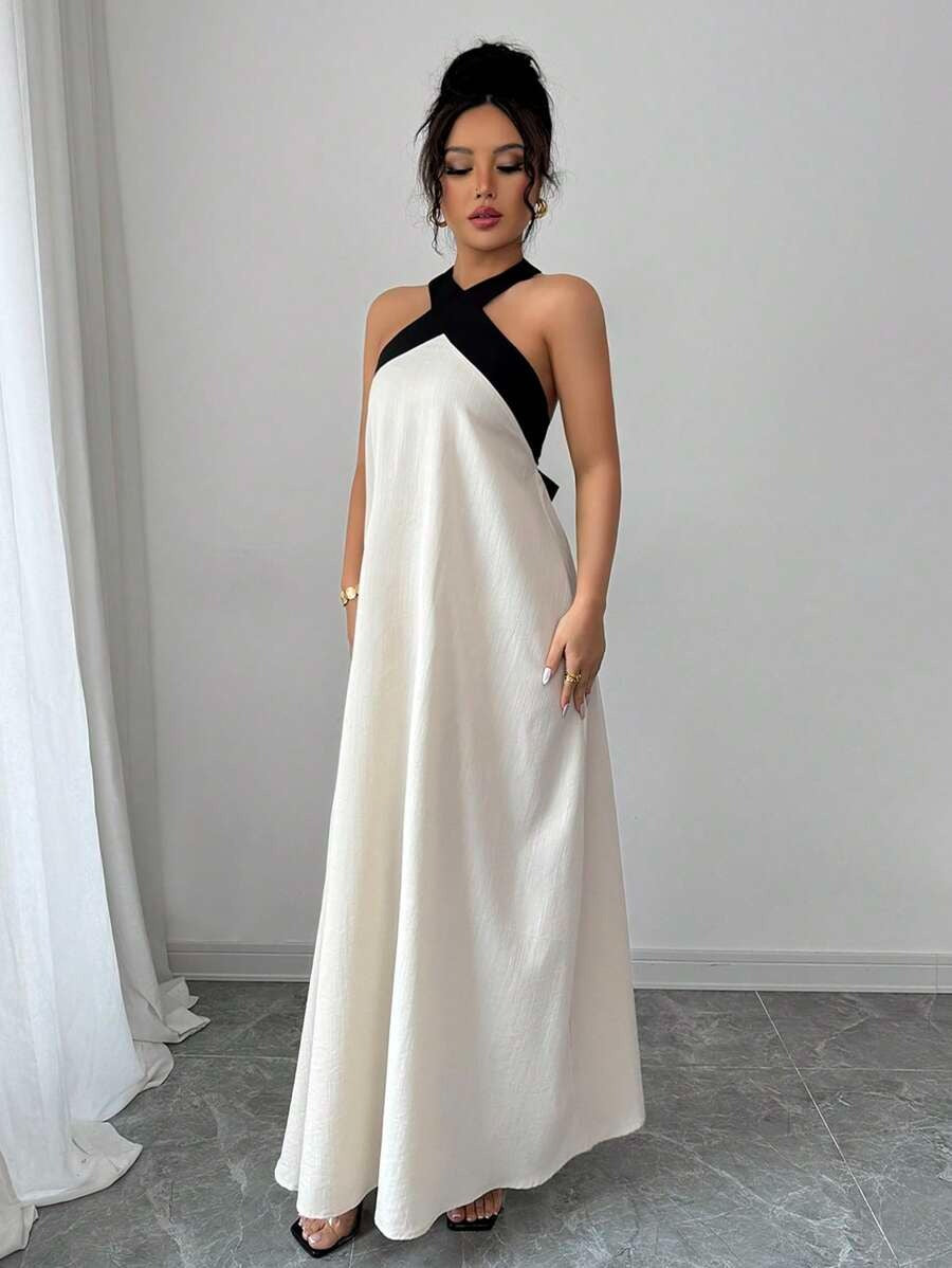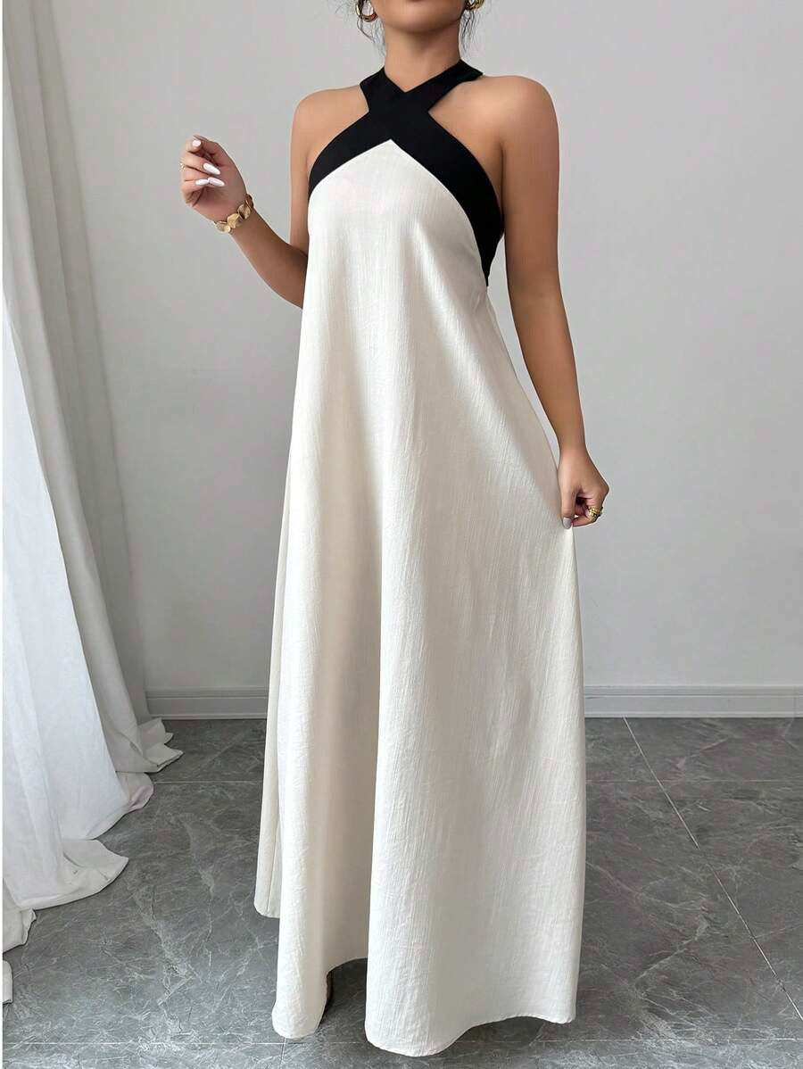 SHEIN Rafferiza فستان ماكسي أنيق بلون كاكي بدون أكمام وظهر مكشوف