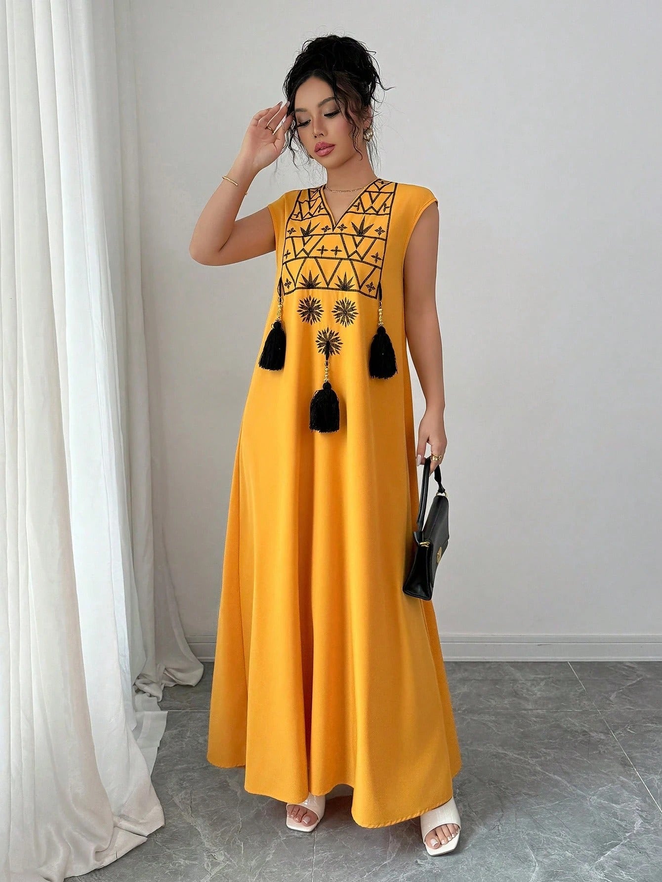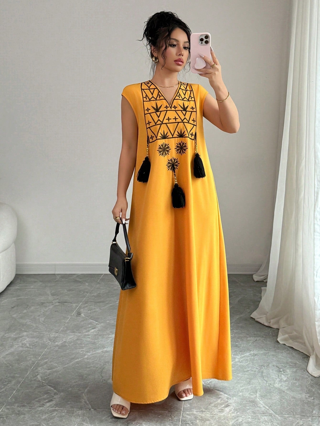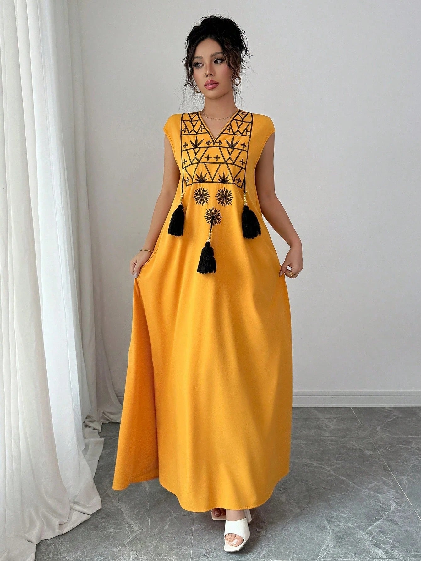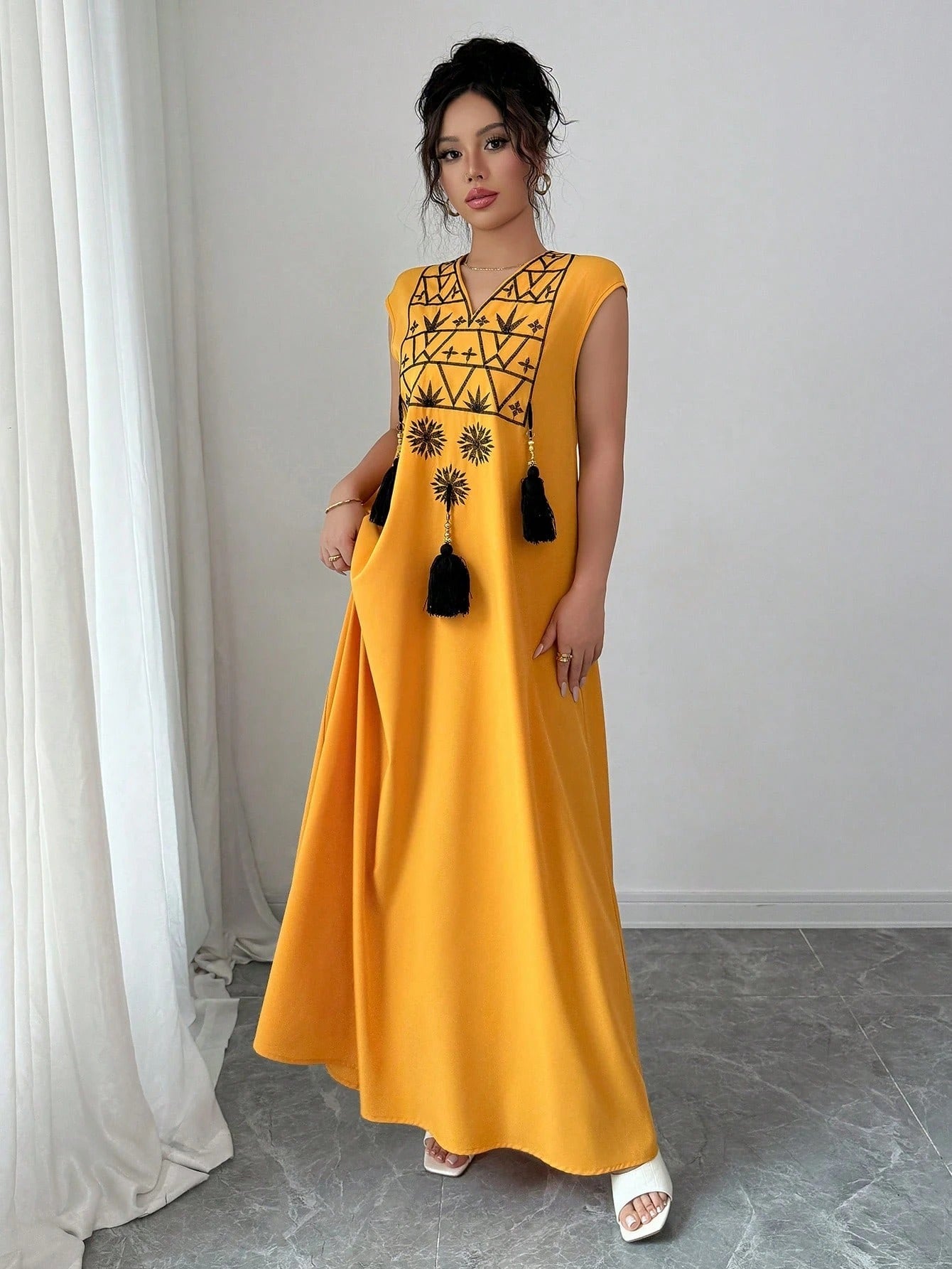 SHEIN Rafferiza فستان مستقيم فضفاض بياقة V بنمط مطرز وشراريب