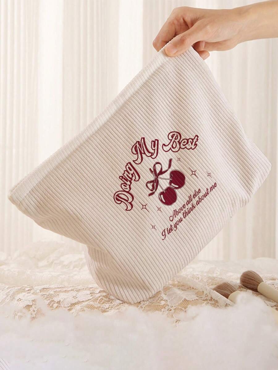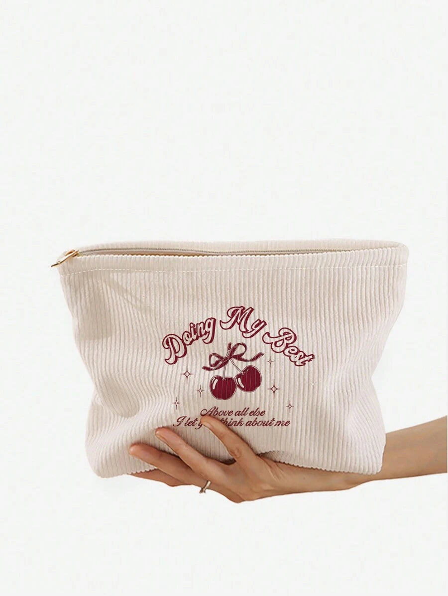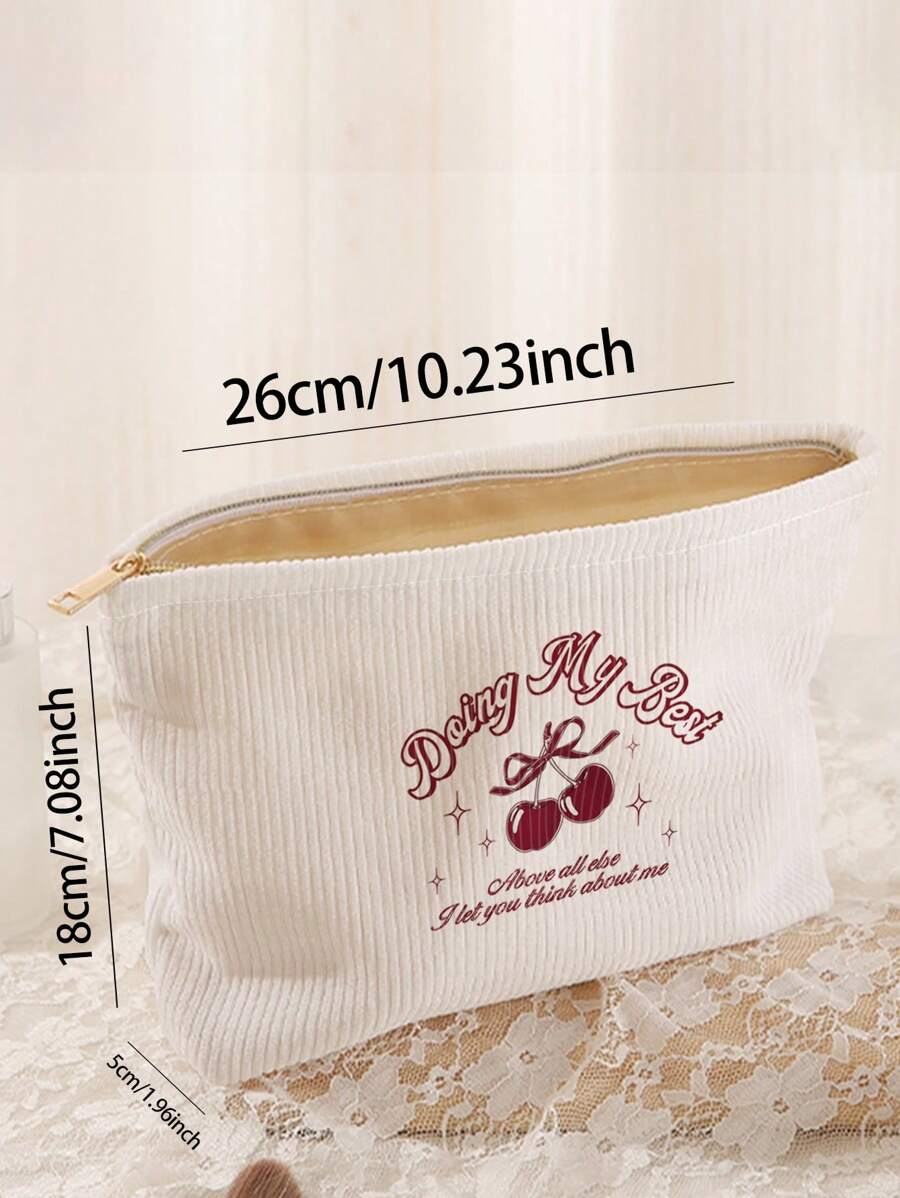 SHEIN ROMWE Kawaii حقيبة تجميل كورديروي بطبعة كرز وحروف مطبوعة على الوجهين