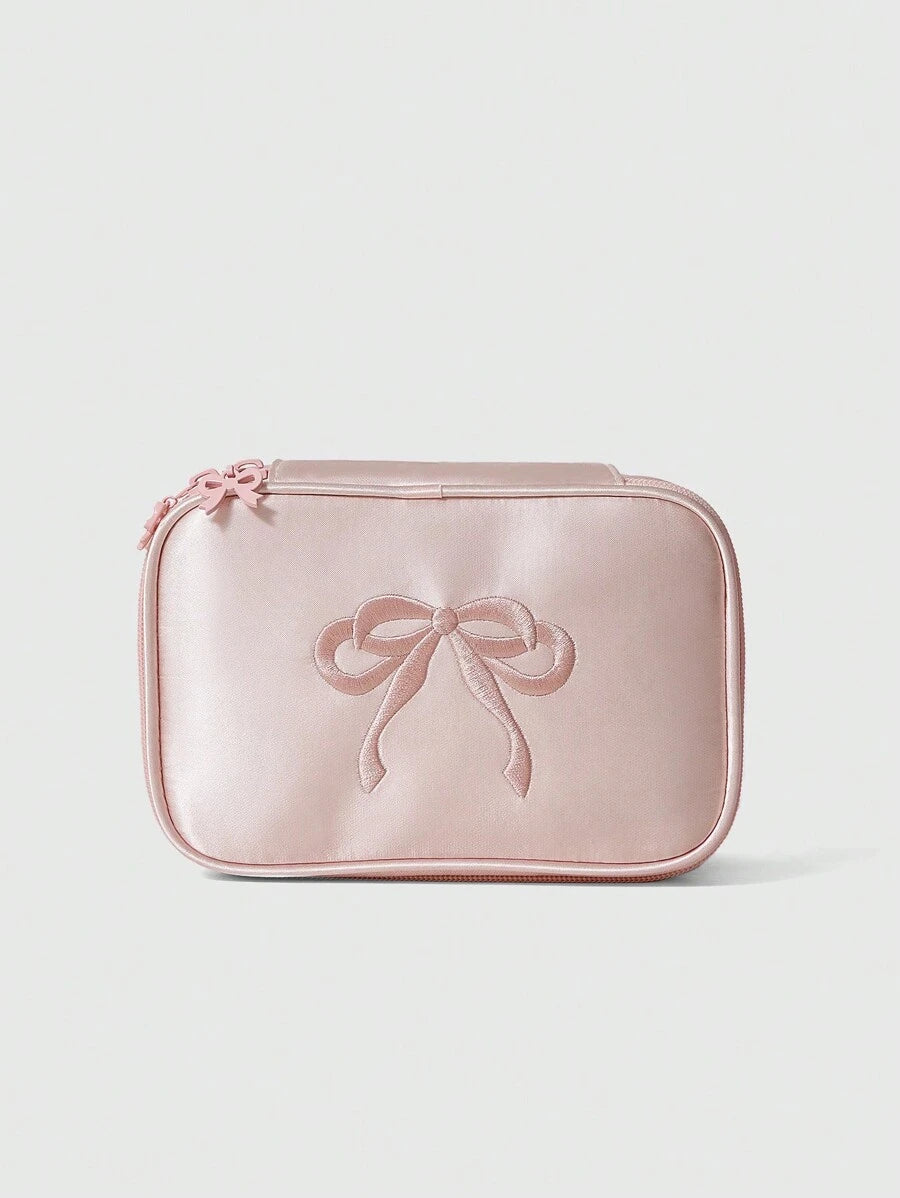 🎀 حقيبة مكياج ROMWE Kawaii – ساتان وردي مطرّز مع شريطة