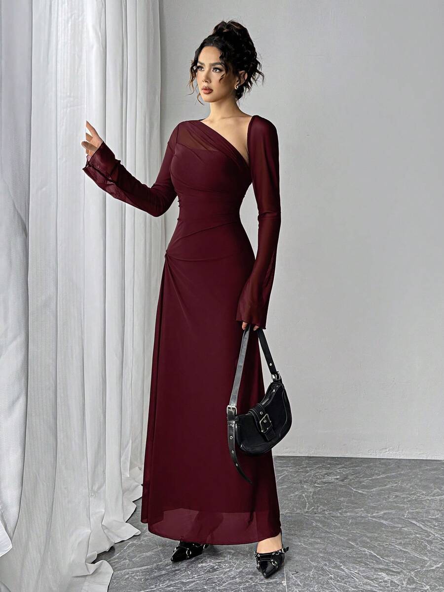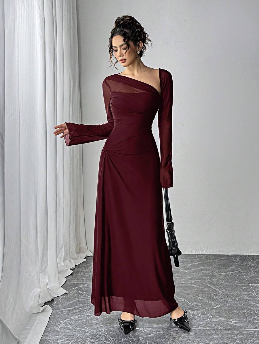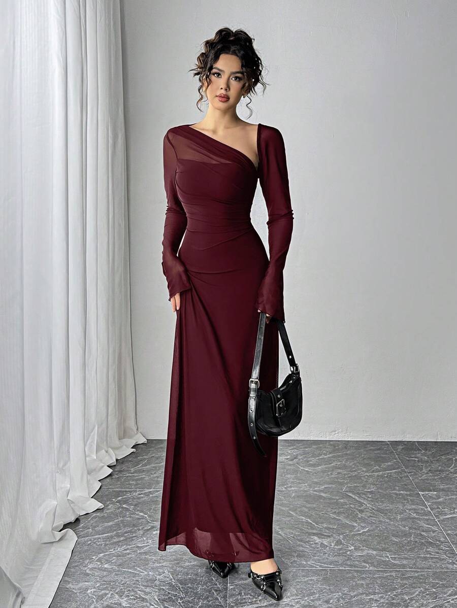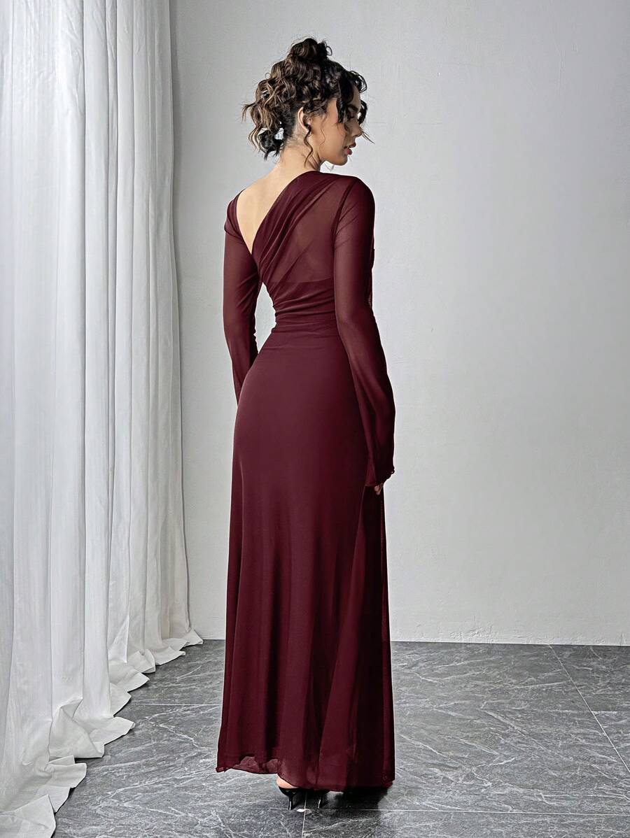 SHEIN Siren Gaze فستان طويل عنابي من قماش شبكي شفاف