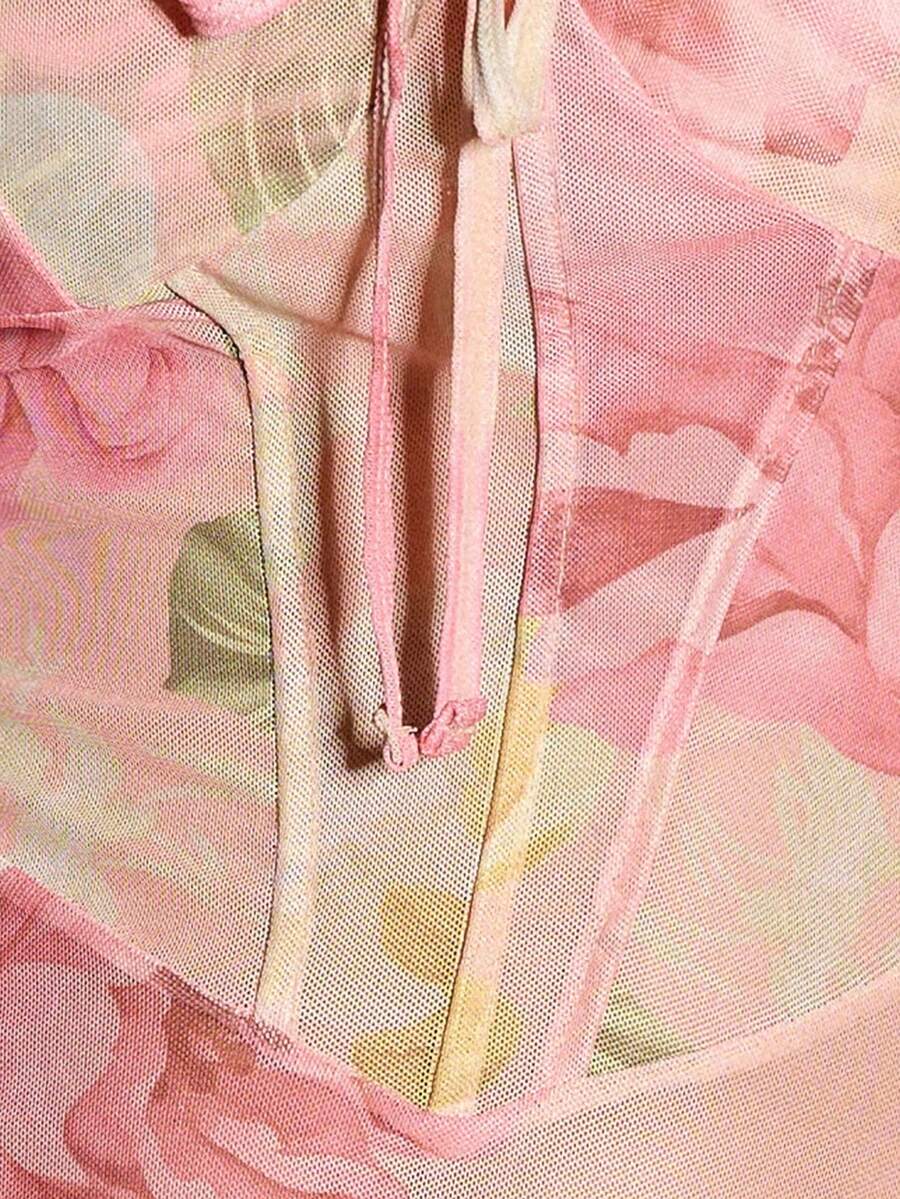 SHEIN Slumberist قميص نوم بطبعة زهرية وتطريز كشكش على الشبكة