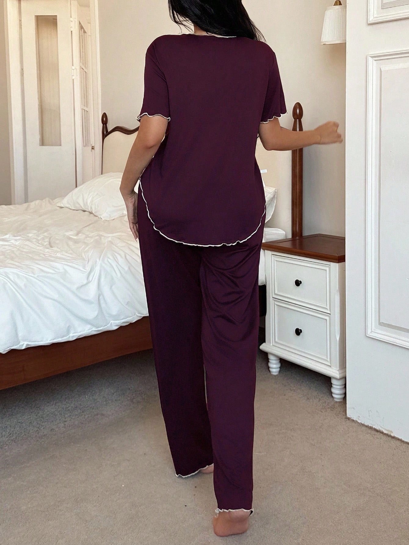 مجموعة مكونة من قطعتين: قطعة علوية قصيرة الأكمام وبنطلون طويل من قماش الحرير الحليبي الناعم.