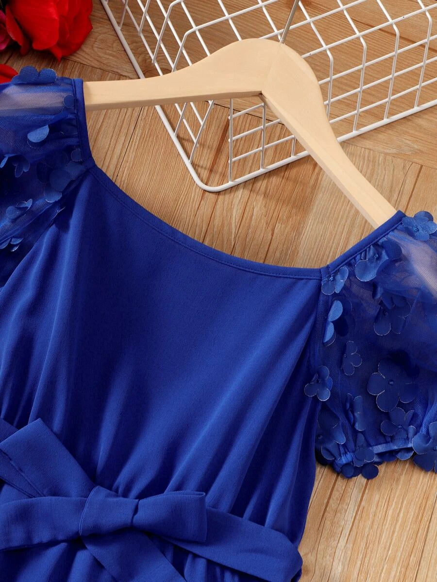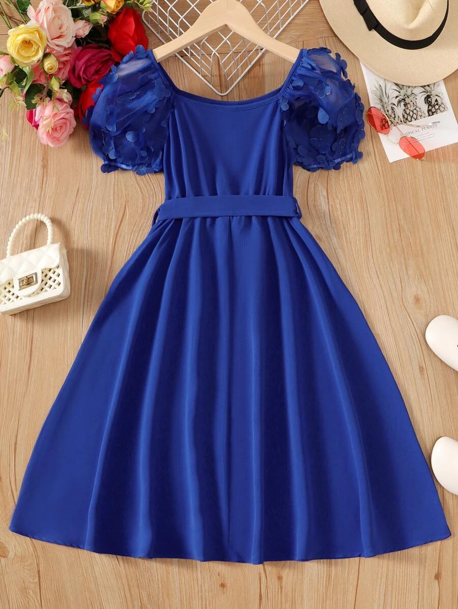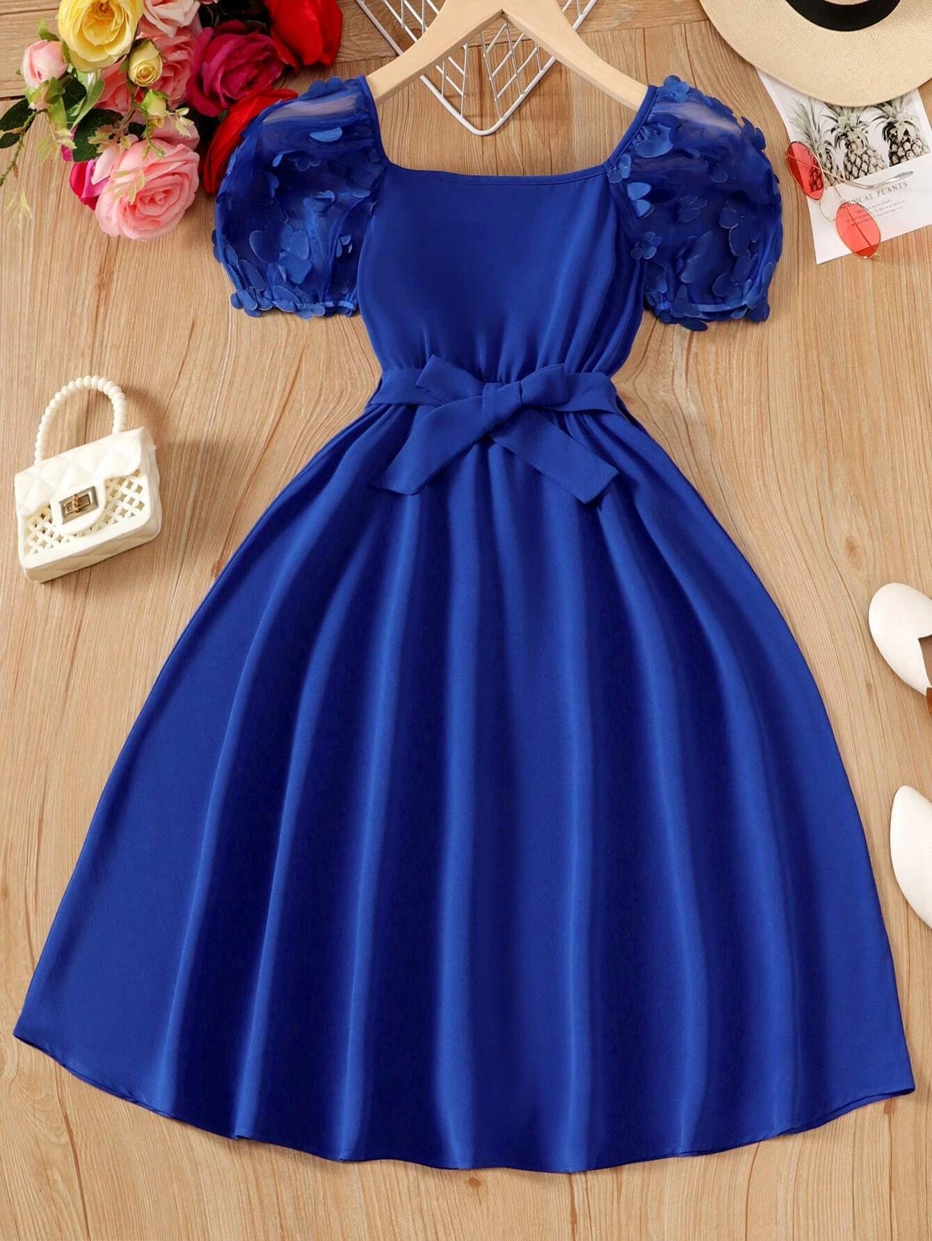 SHEIN Tween فستان للفتاة بتطريزات وأكمام منتفخة مصنوعة من نسيج شبكي، مع حزام