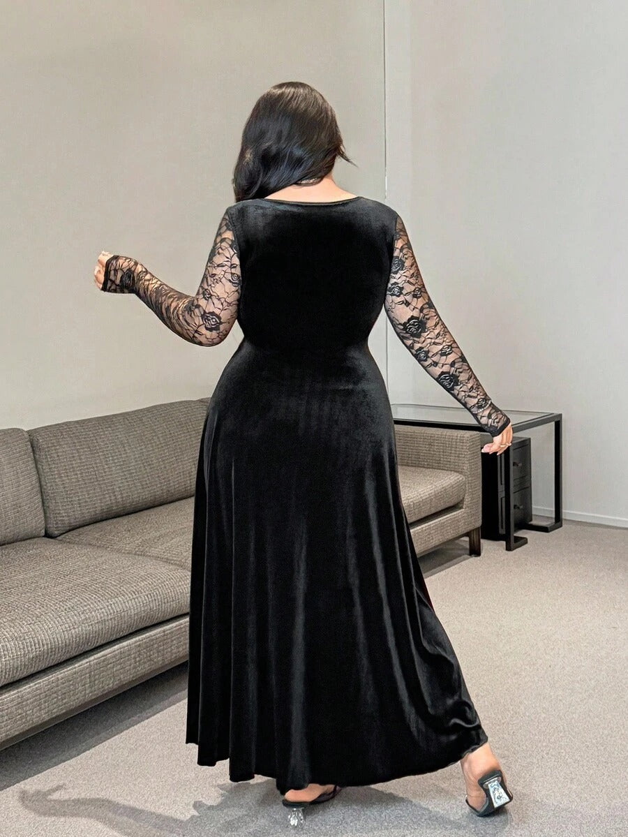فستان ماكسي أنيق من المخمل للمقاسات الكبيرة، تصميم A-line مريح مع رقبة V وربطة عنق، مزين بتطريز دانتيل على شكل لحاء. الأكمام طويلة وتدي إحساس بالنعومة والفخامة، مثالي لموسم الخريف والشتاء.