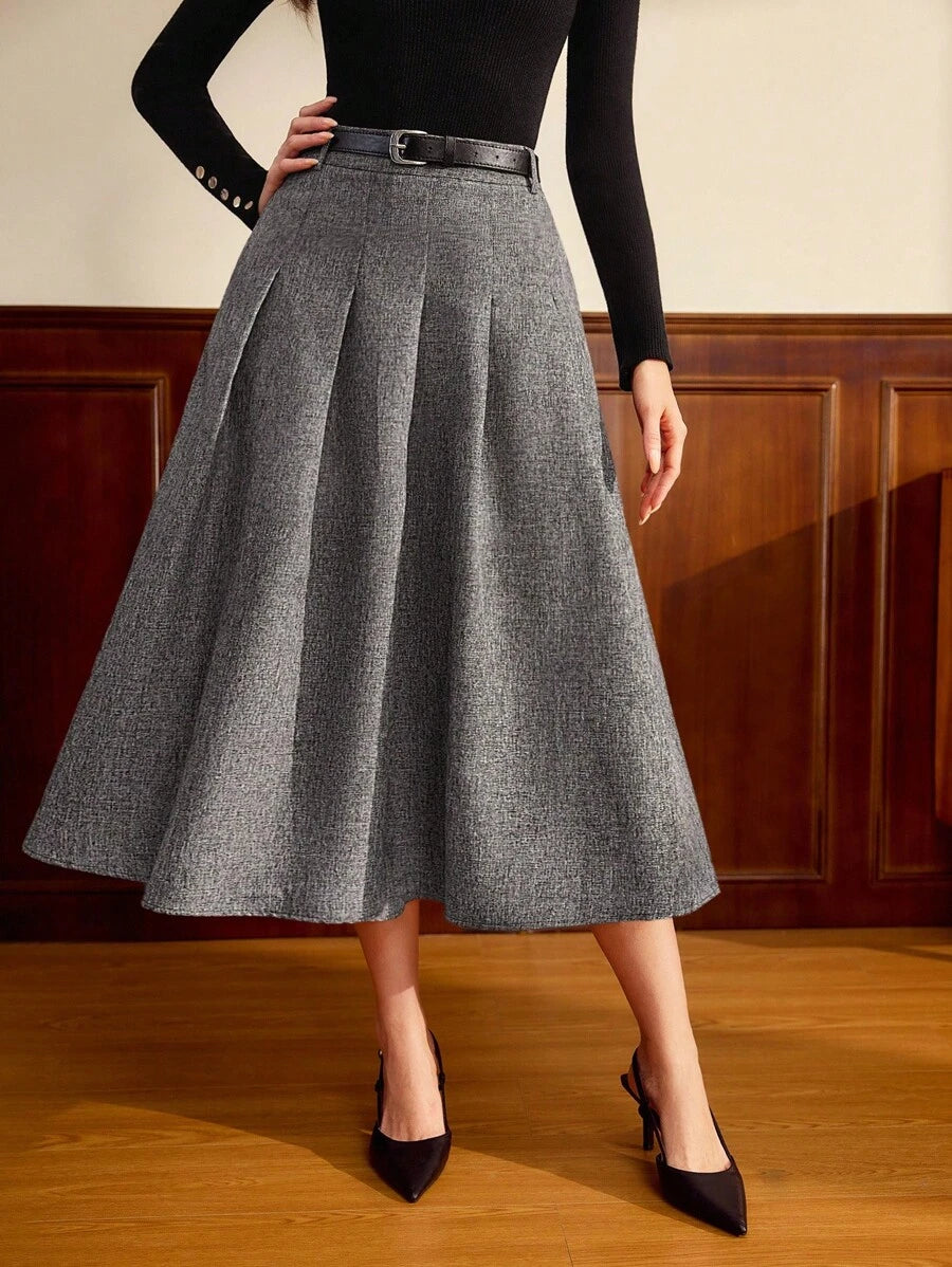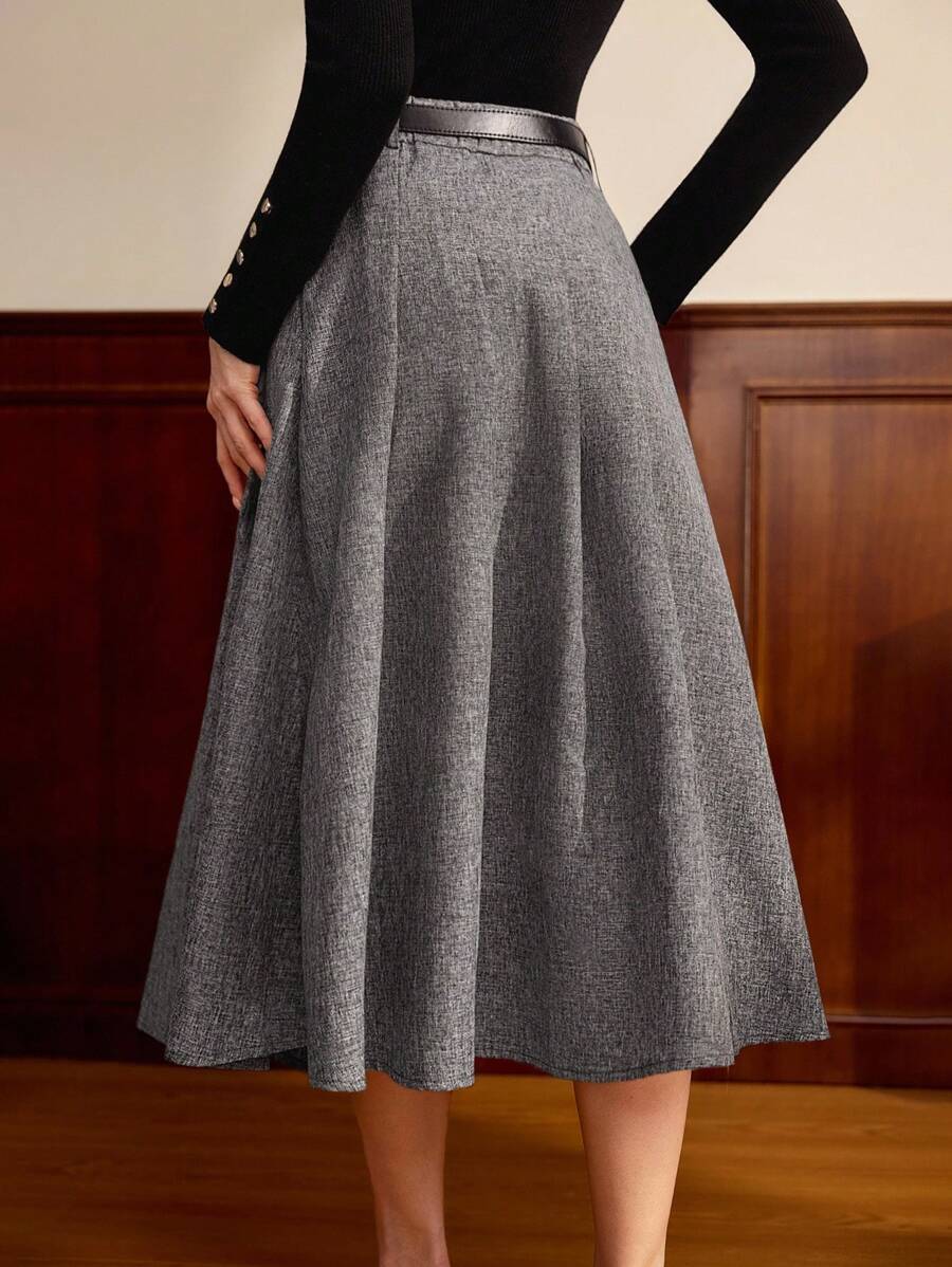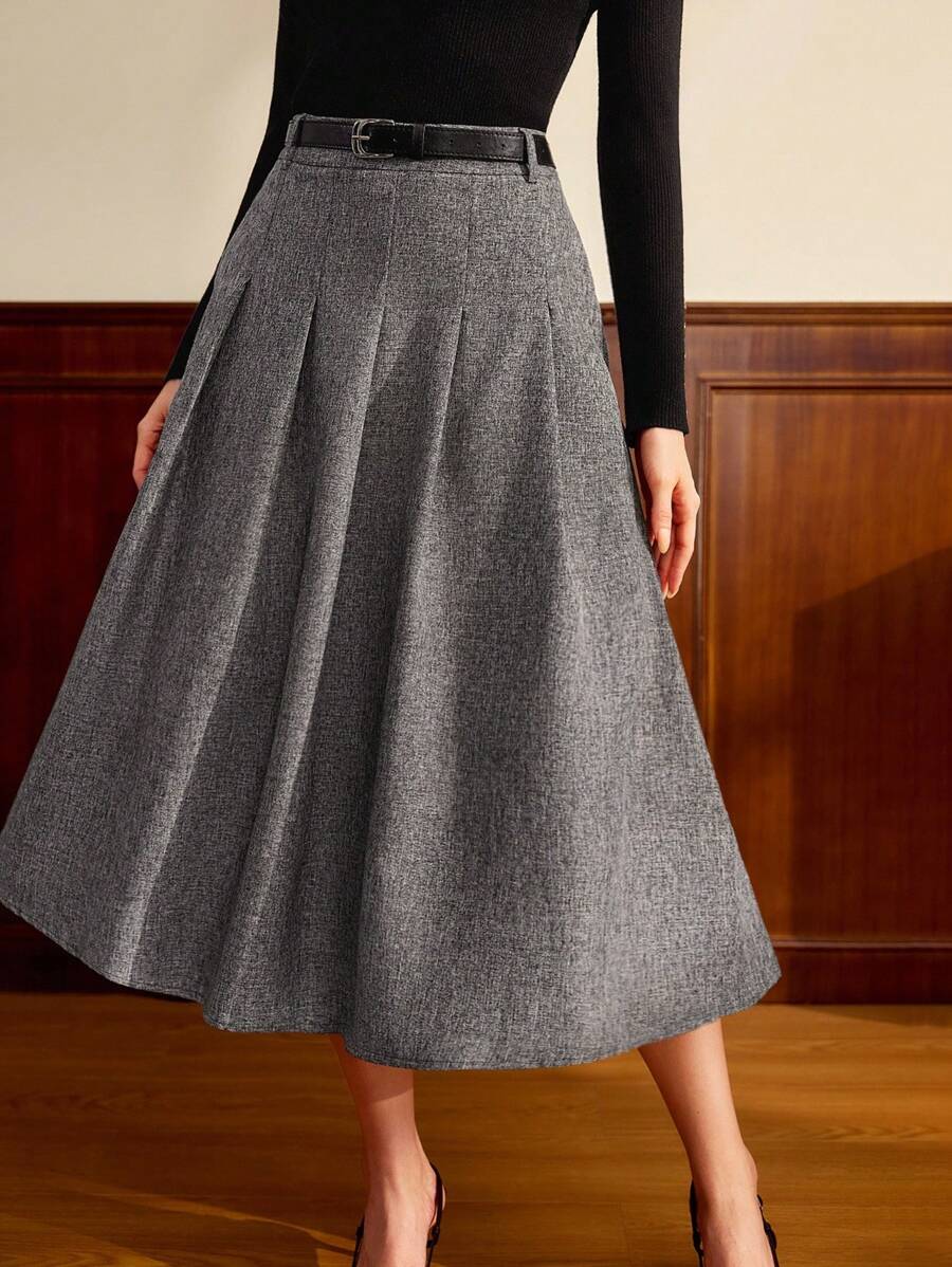 SHEIN Vintamour تنورة رمادية كلاسيكية مطوية معها حزام