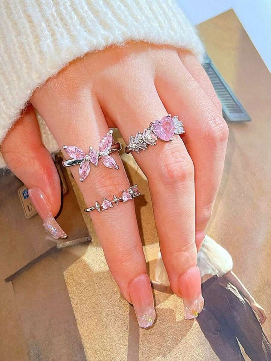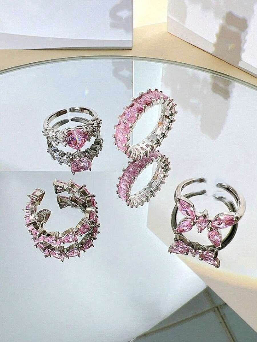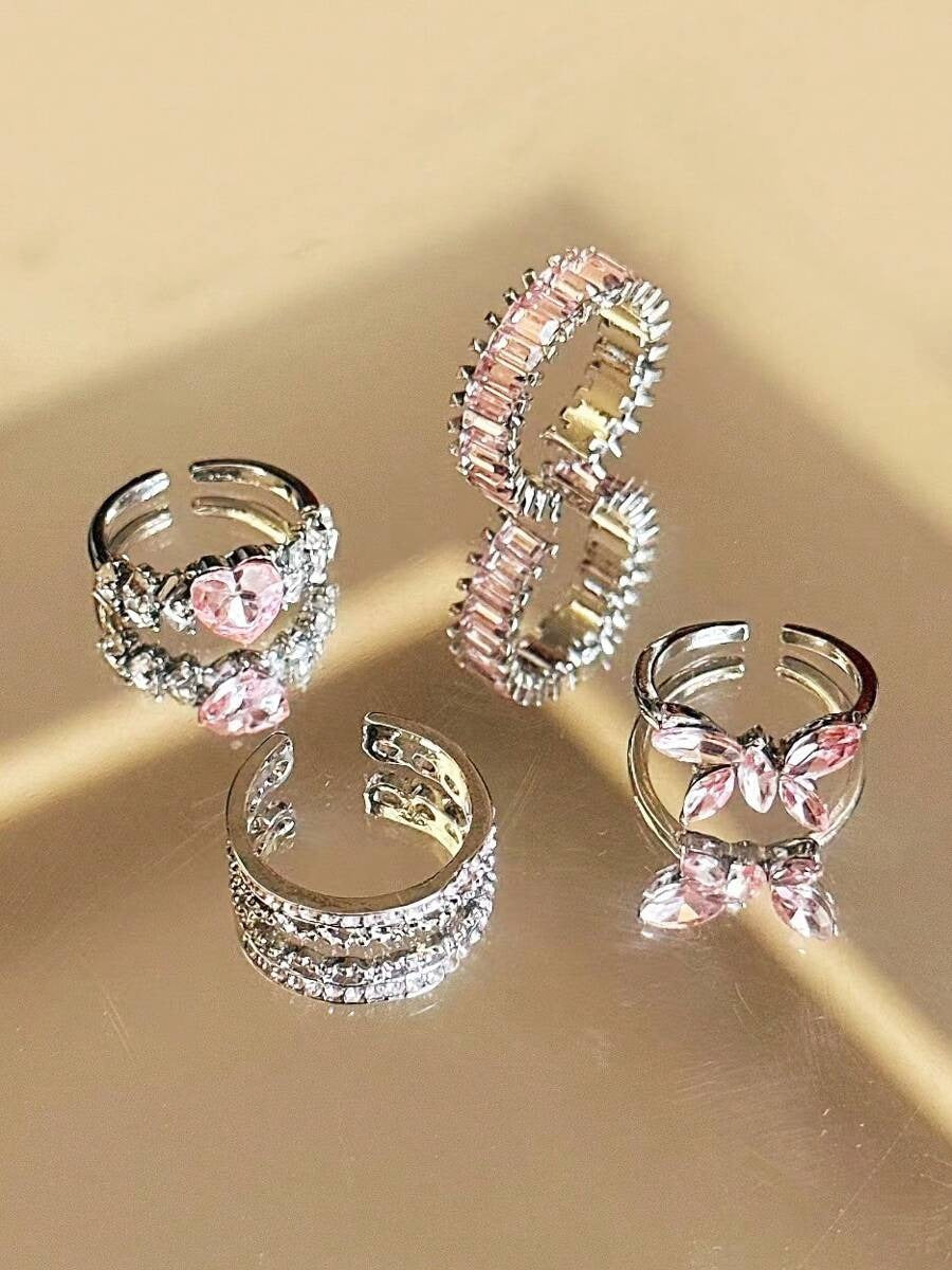 SHEIN Y2K طقم 4 خواتم كريستال وردي ستايل